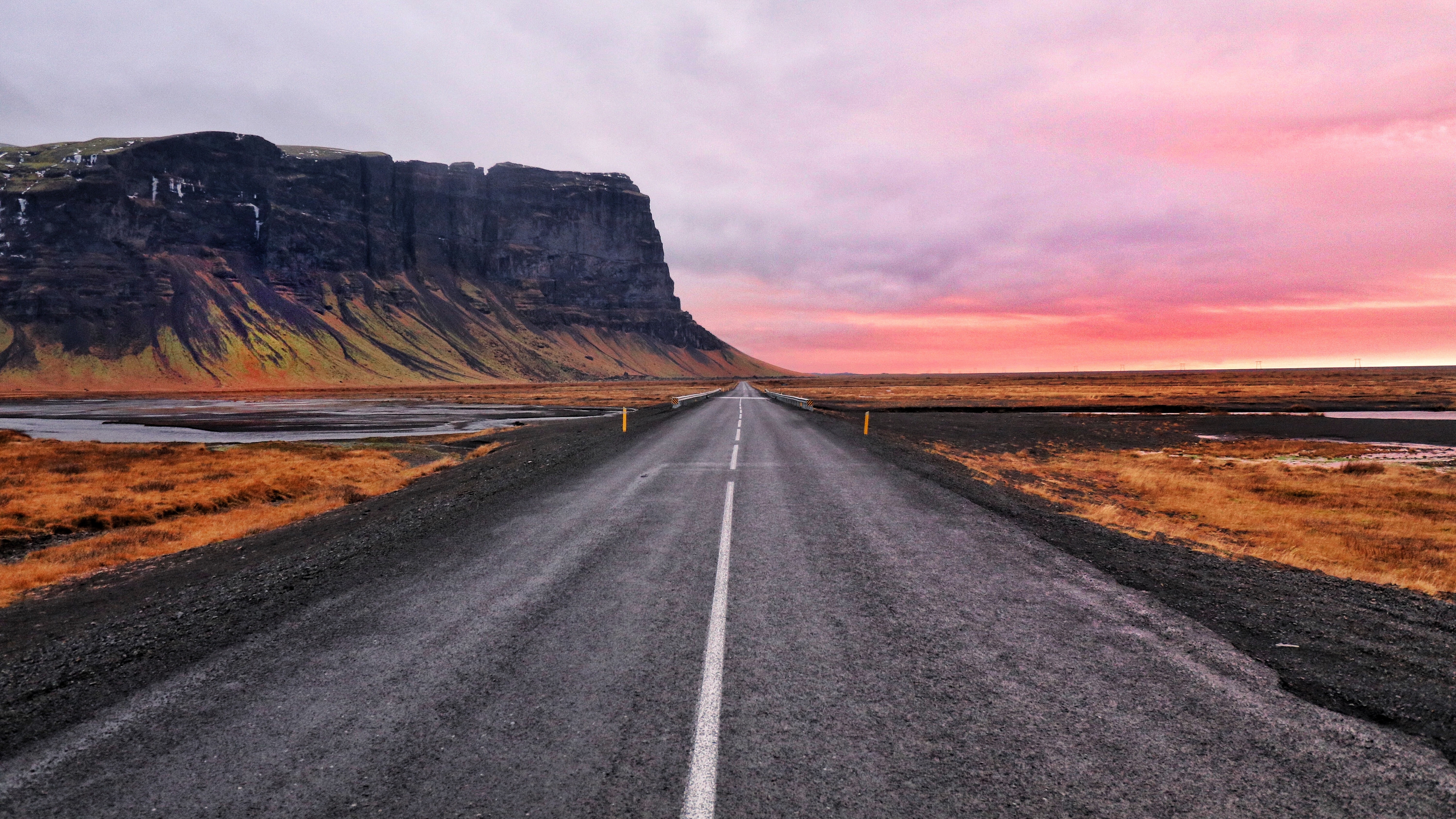 Description: A long road with a mountain in the background at sunset or sunrise or sunset.