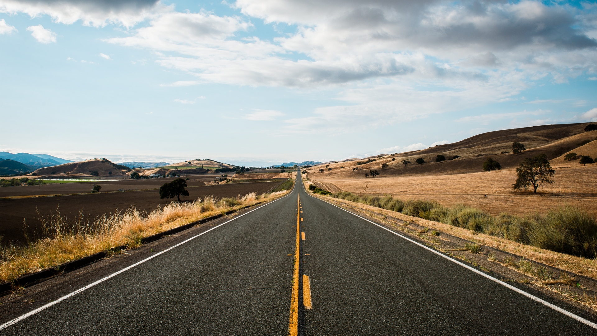 Description: A long empty road with a sky background and a field of grass and trees in the distance with a few clouds.