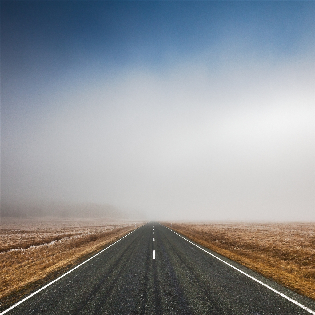 Description: A long road with a line of white lines on the side of it in the middle of a field.