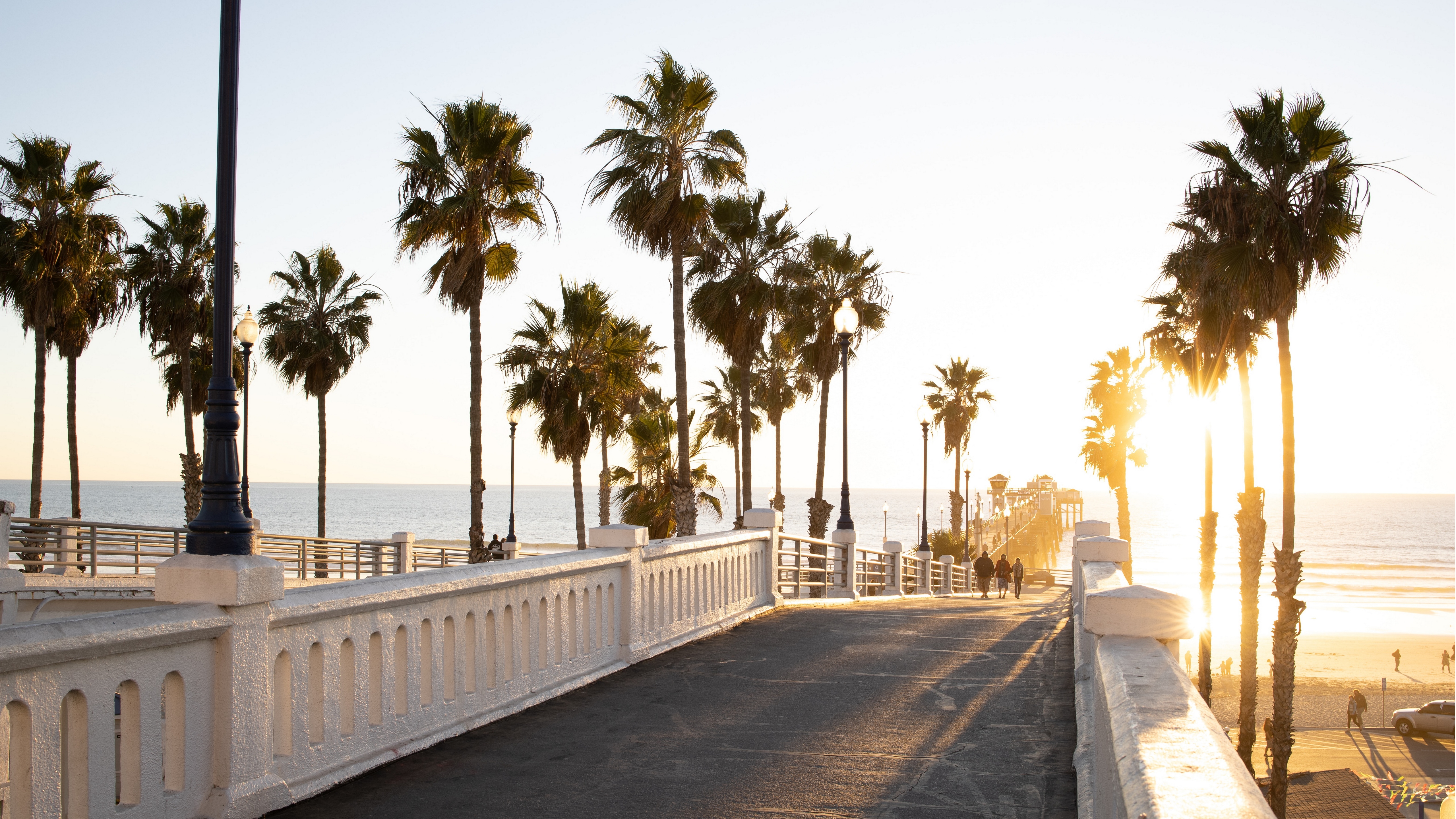 Description: A long white fence with palm trees on the side of it and a beach in the background with a person walking on the sidewalk.