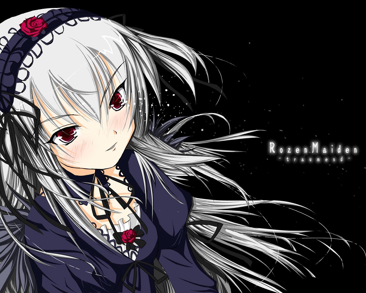 Description: A anime character with long white hair and a black background with a red rose on her head and a black background with a white background.