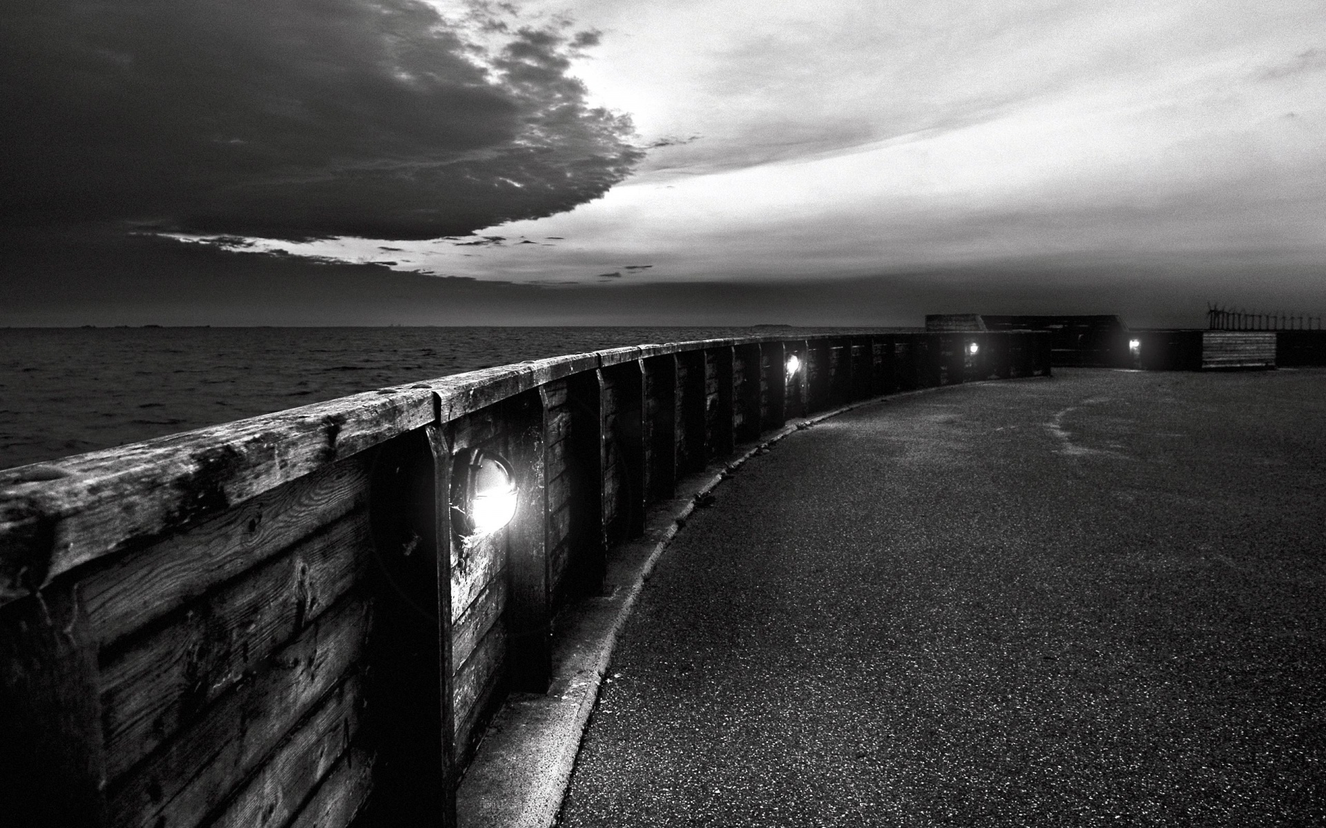 Description: A long wooden pier with lights on it's sides and a dark sky above it.