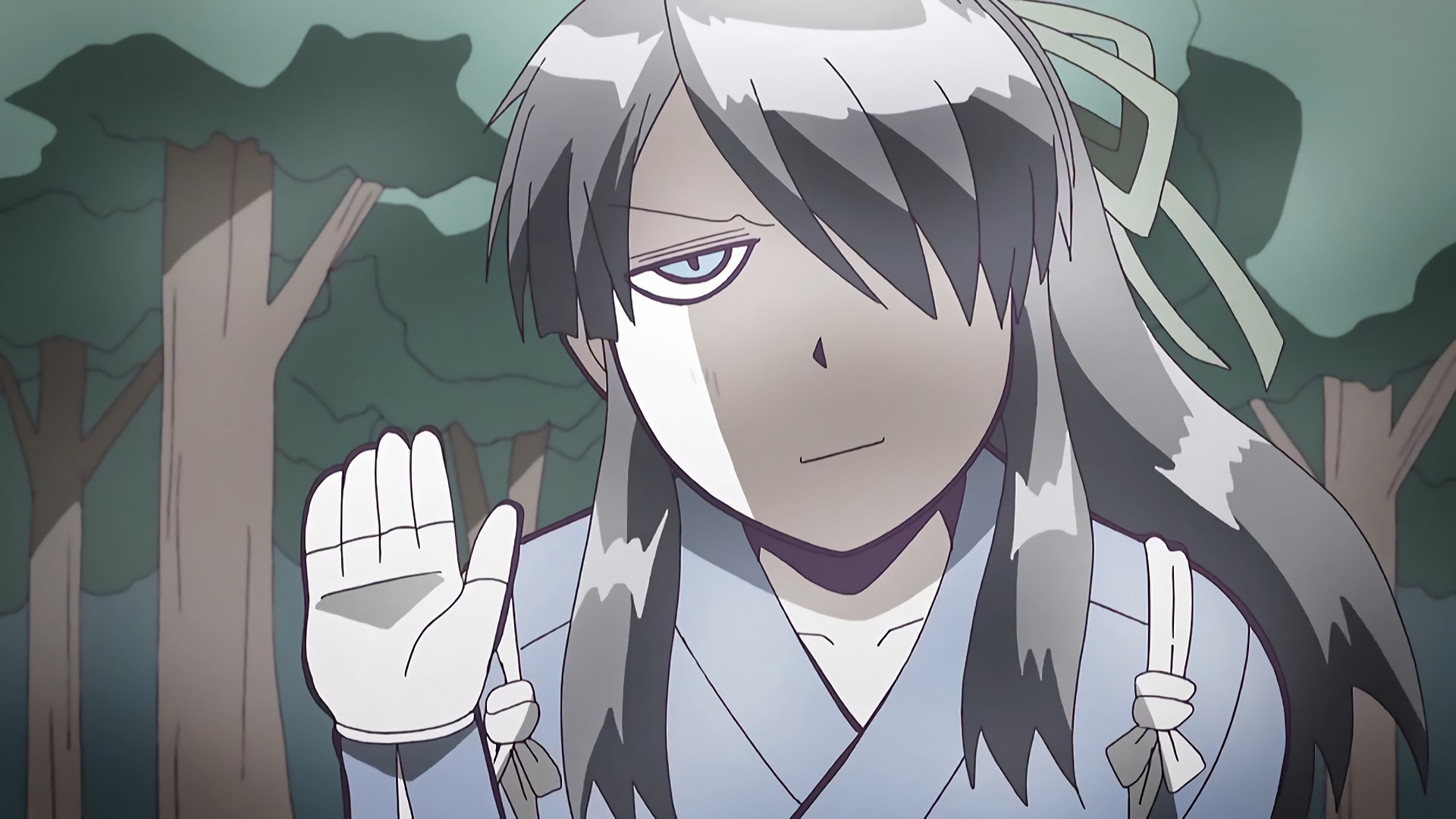 Description: A person with long hair and a hand up in the air with trees in the background and a forest in the foreground.