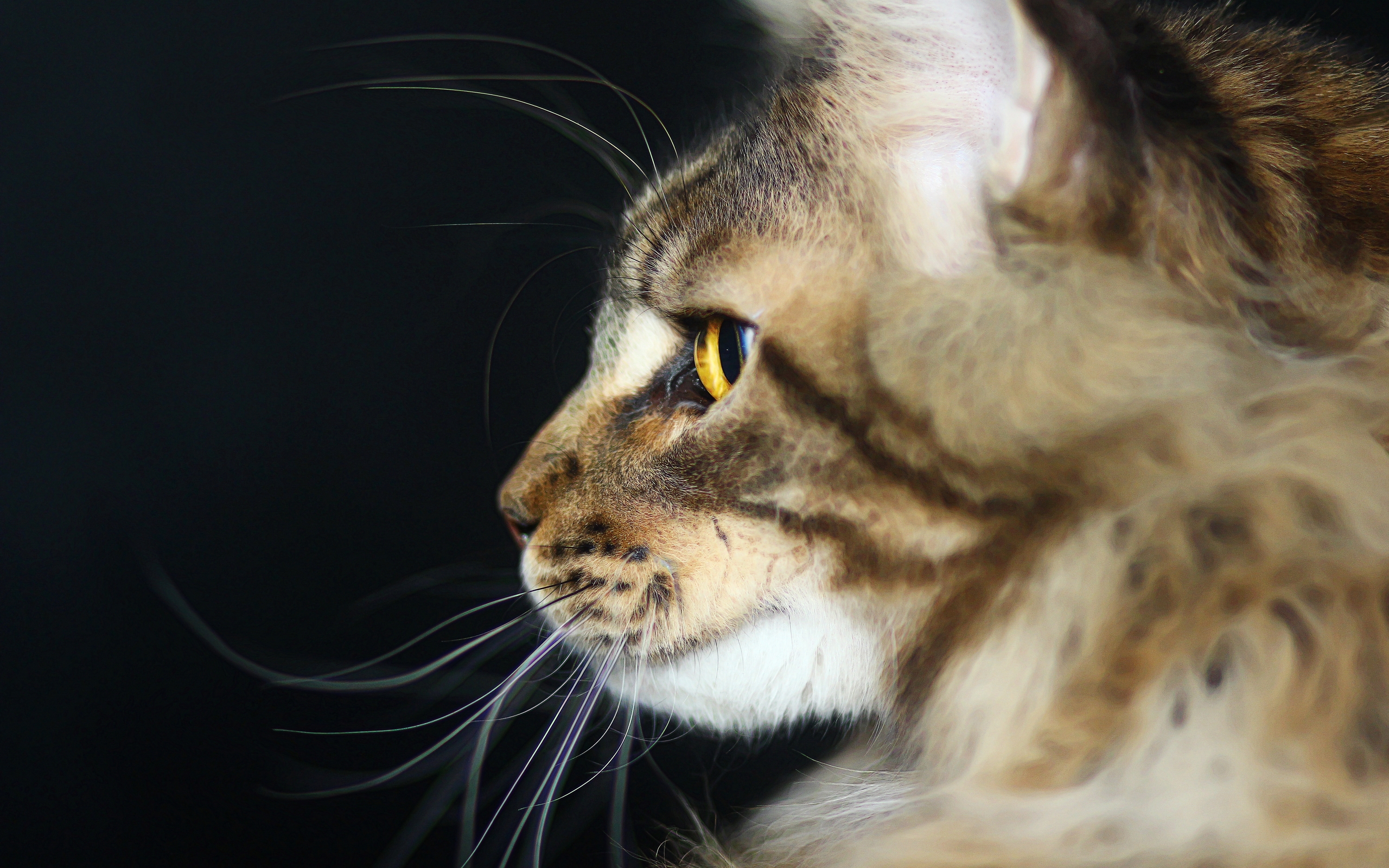 Description: A cat with long hair looking off into the distance with a black background and a black background behind it.