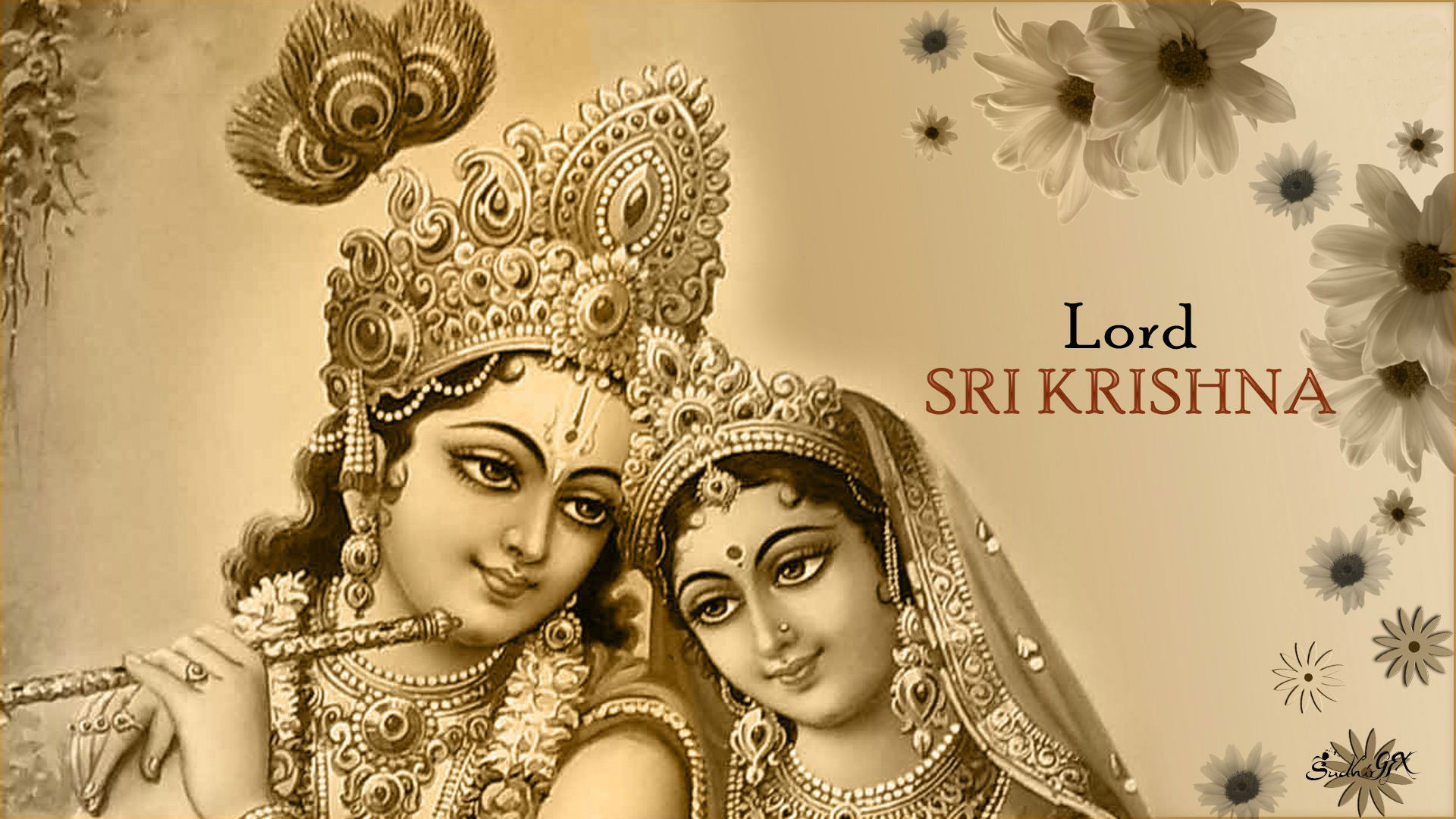 Description: A painting of two women in traditional indian garb and a floral background with the words lord sri sri srishna.