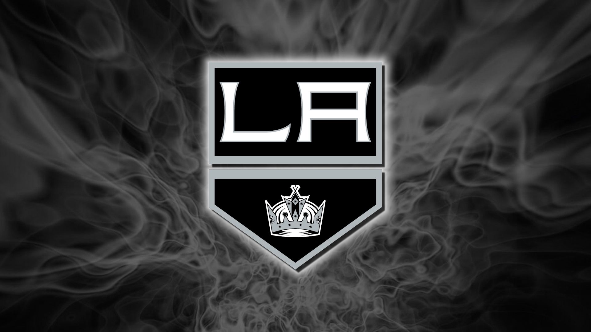 Description: A black and white photo of a los kings logo with smoke behind it and a crown on top of it.