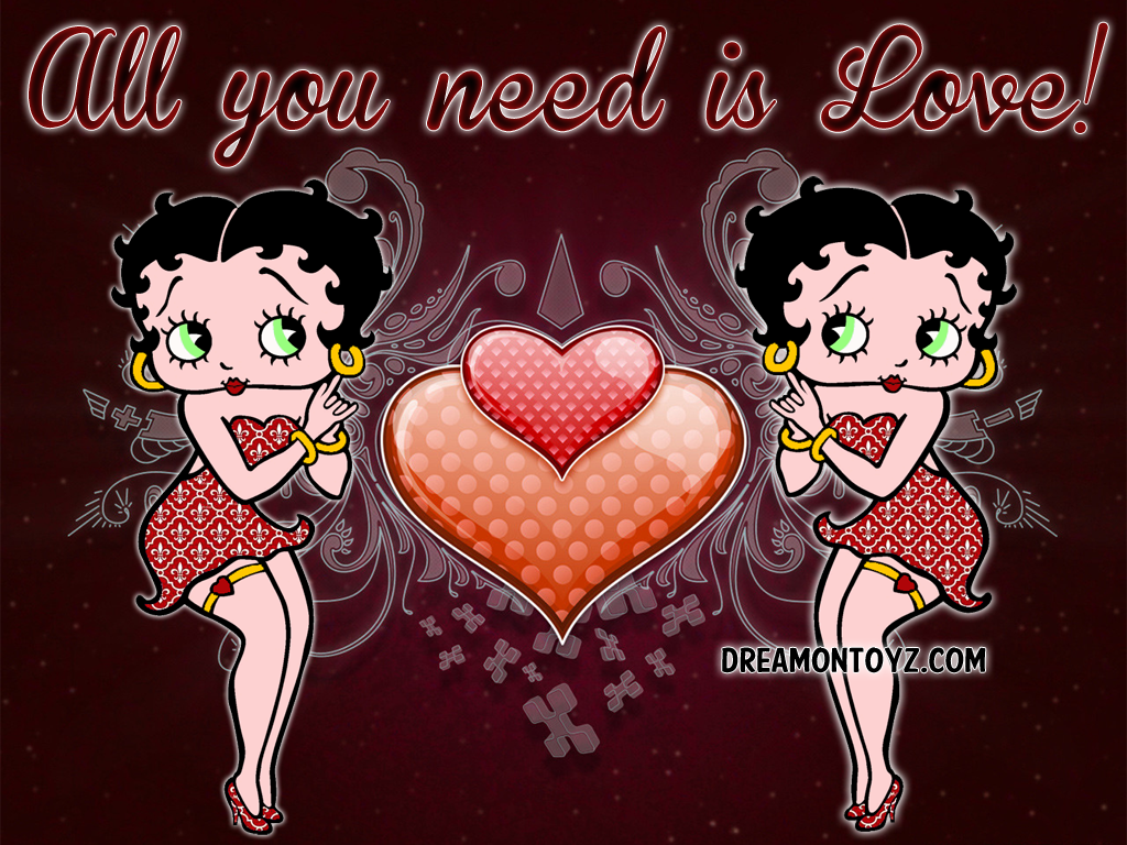 Description: Two cartoon girls holding a heart with the words all you need is love on it and a red background.