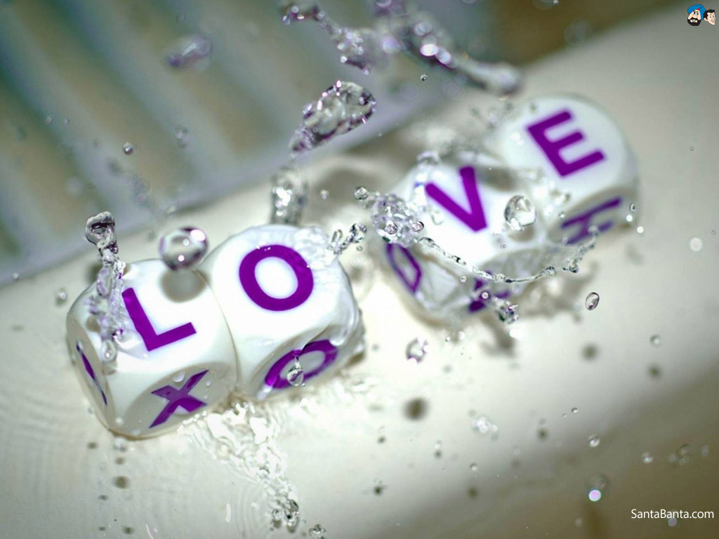 Description: Two dices with the word love spelled on them are floating in water and bubbles on a white surface.