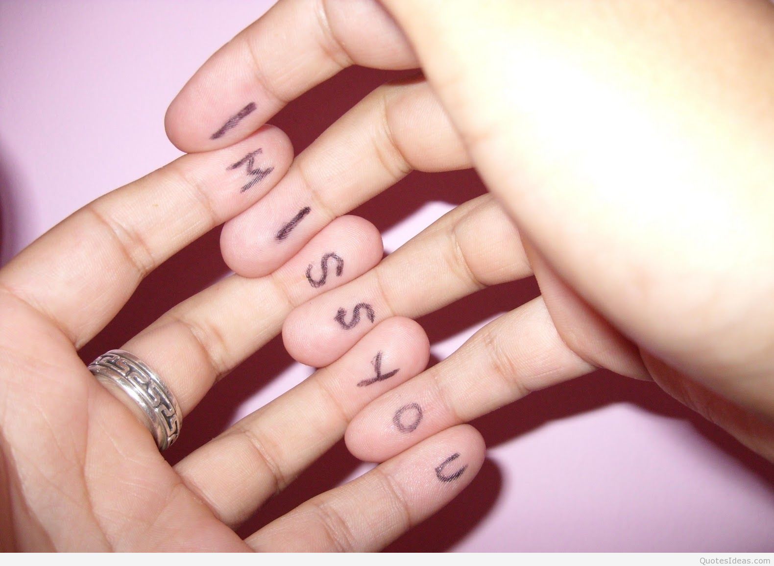 Description: A person holding their fingers with the word love spelled on them with small letters on their fingers and a ring on their thumb.