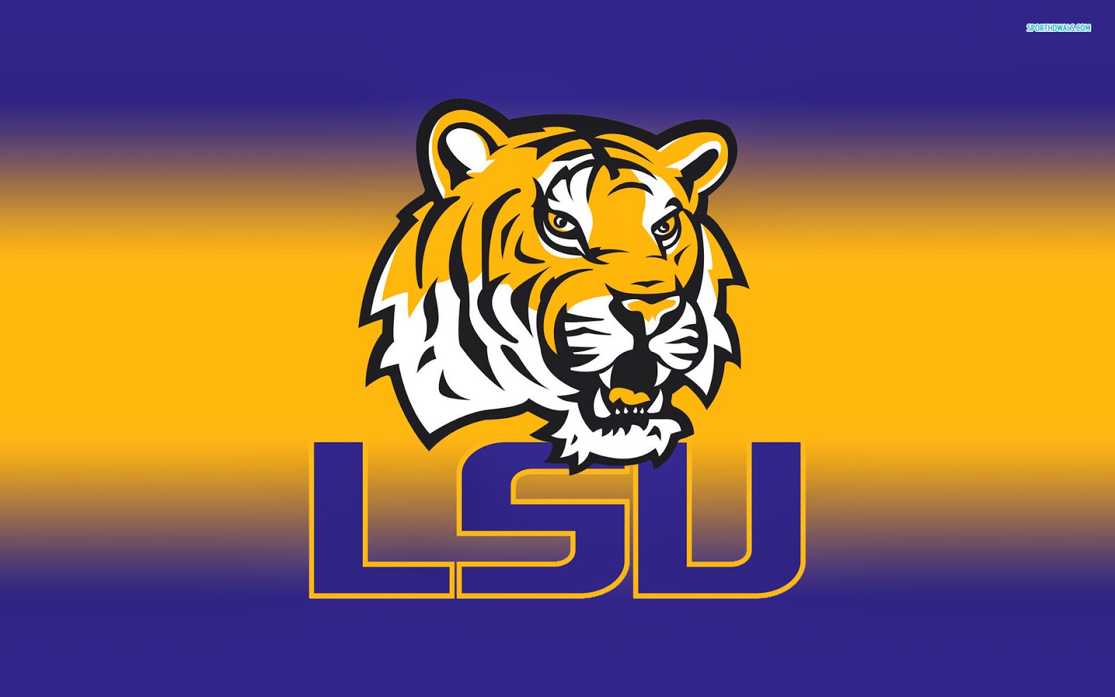 Description: A lsu tiger logo on a purple and yellow background with the word lsu on it's left side.