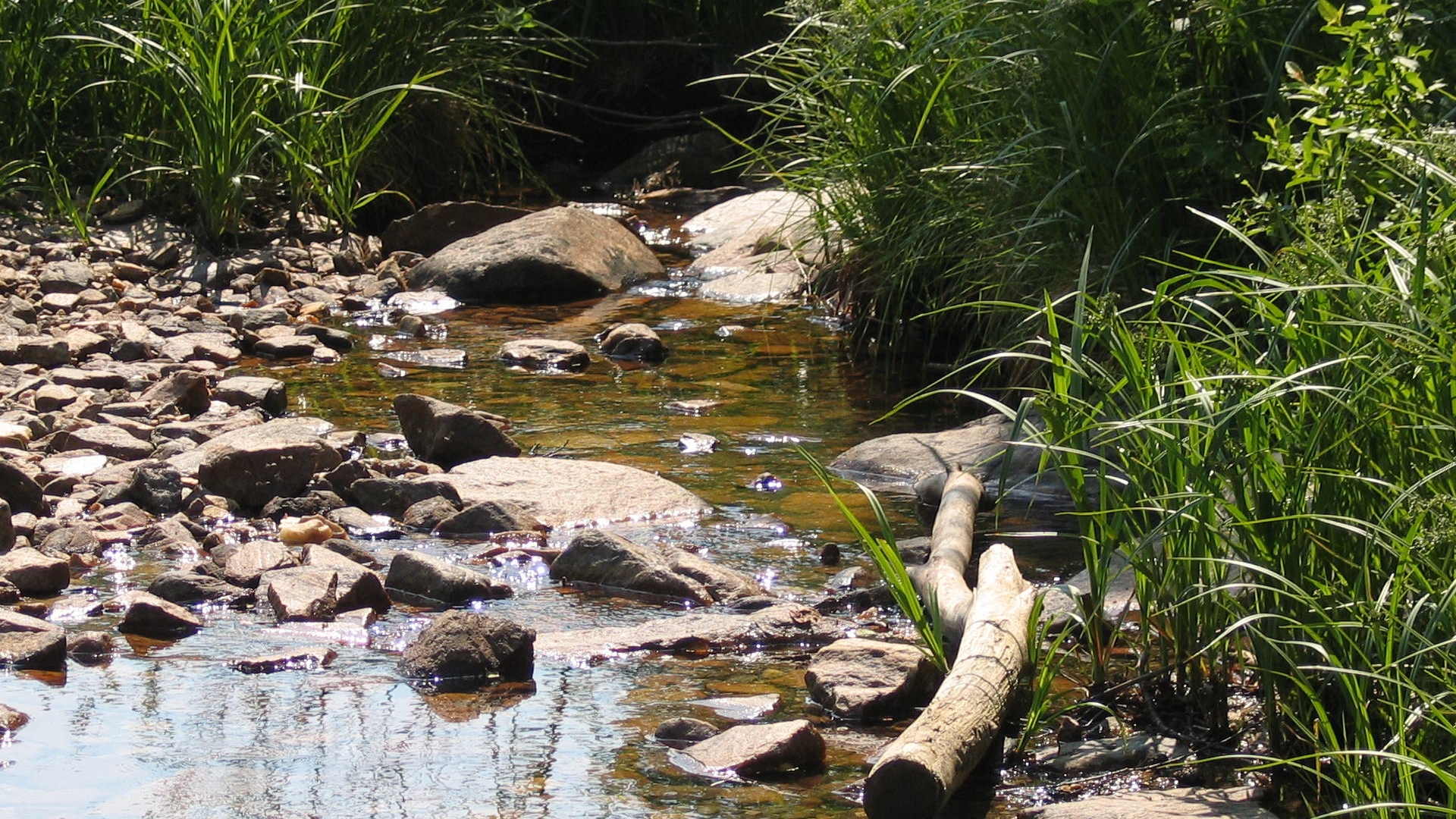 Description: A stream running through a lush green forest filled with rocks and grass.