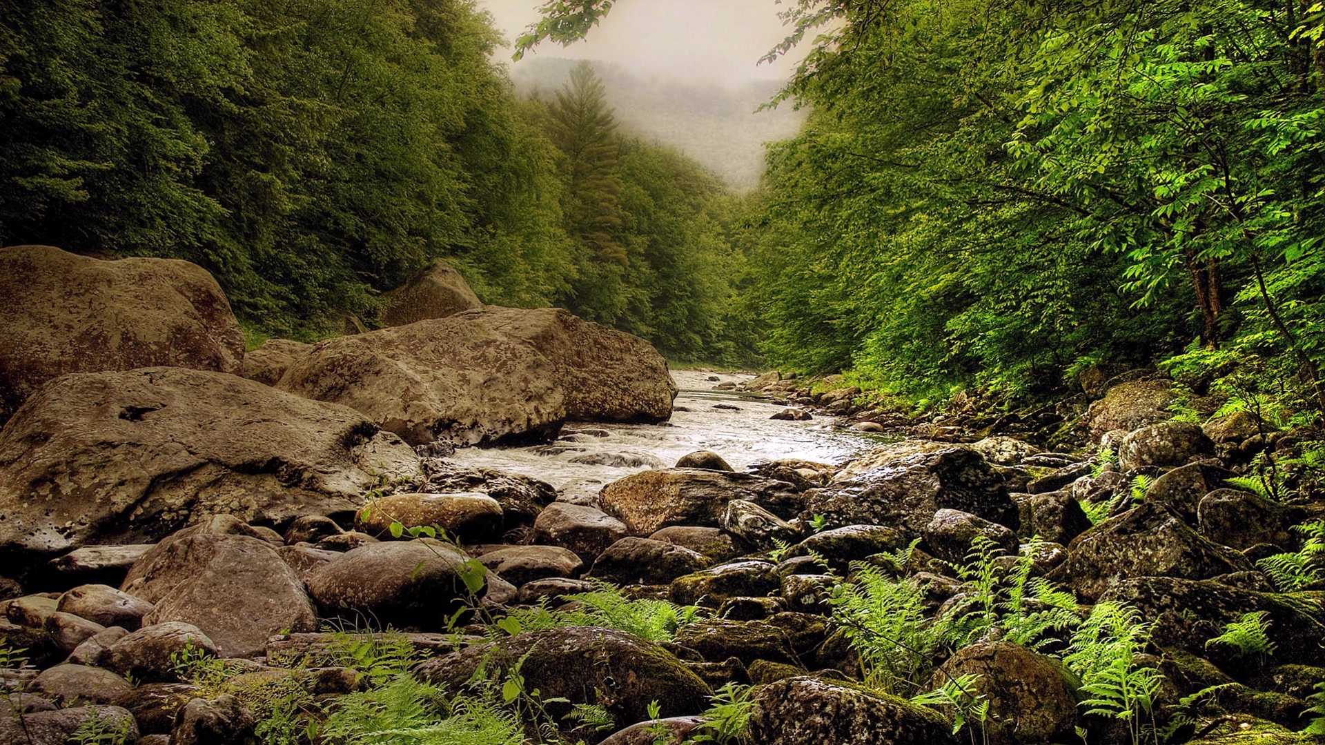 Description: A stream running through a lush green forest filled with rocks and trees.