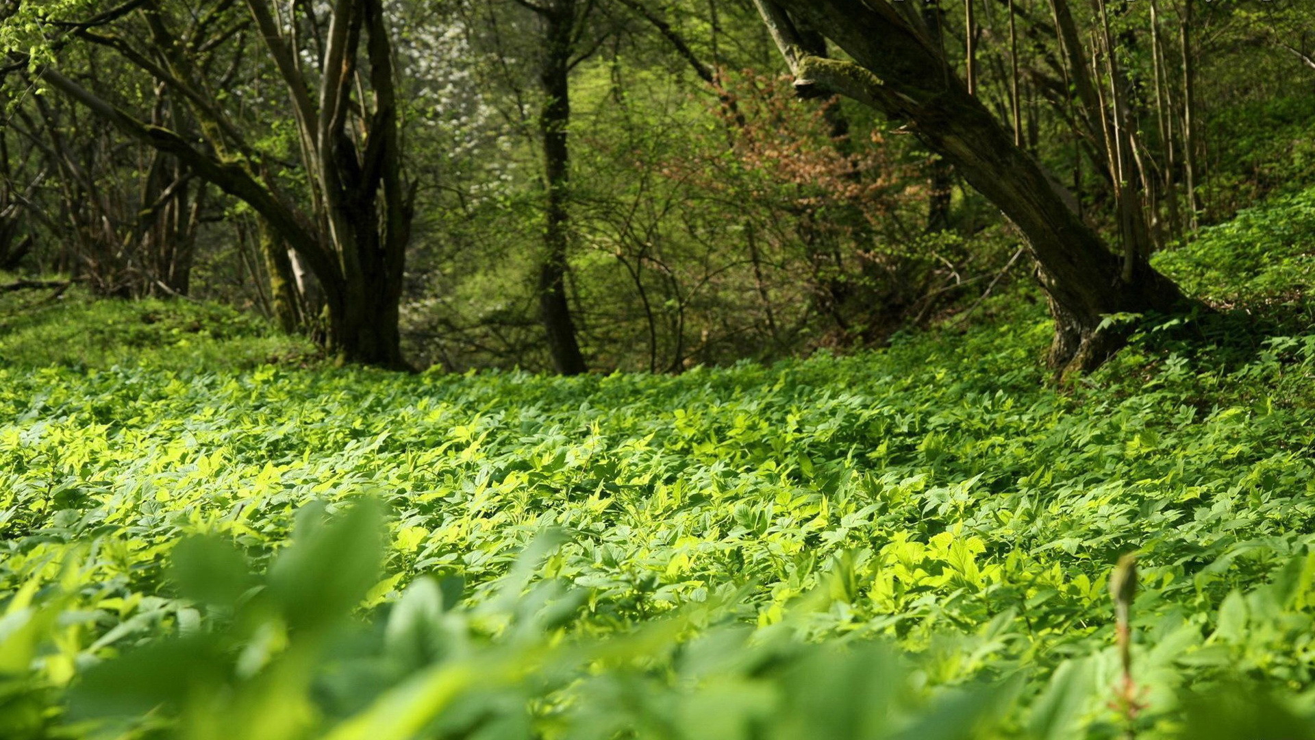 Description: A lush green forest filled with lots of trees and plants on a sunny day with a bench in the middle.