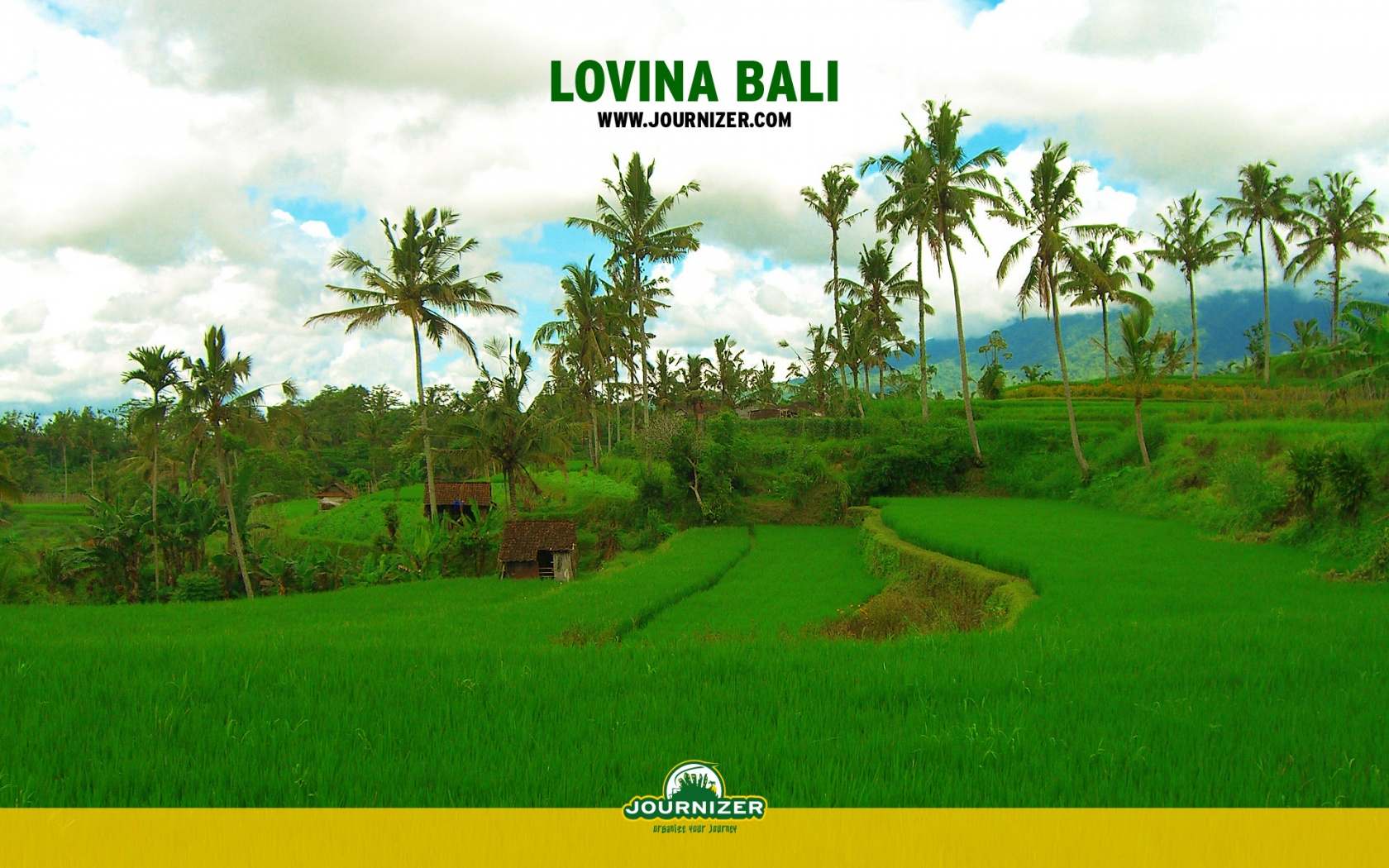 Description: A lush green field with palm trees and a hut in the background with a yellow border around it and a green sky with clouds.