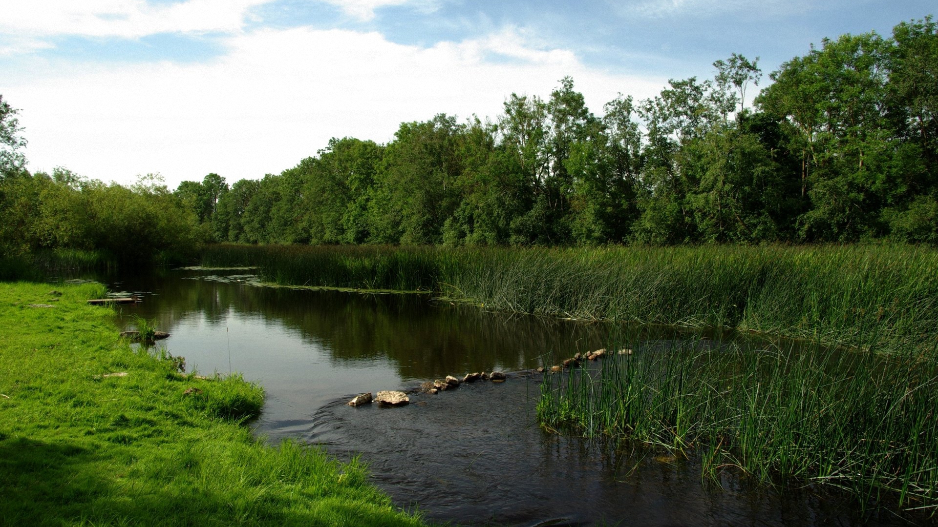 Description: A river running through a lush green forest filled with trees and grass on a sunny day with a few clouds.