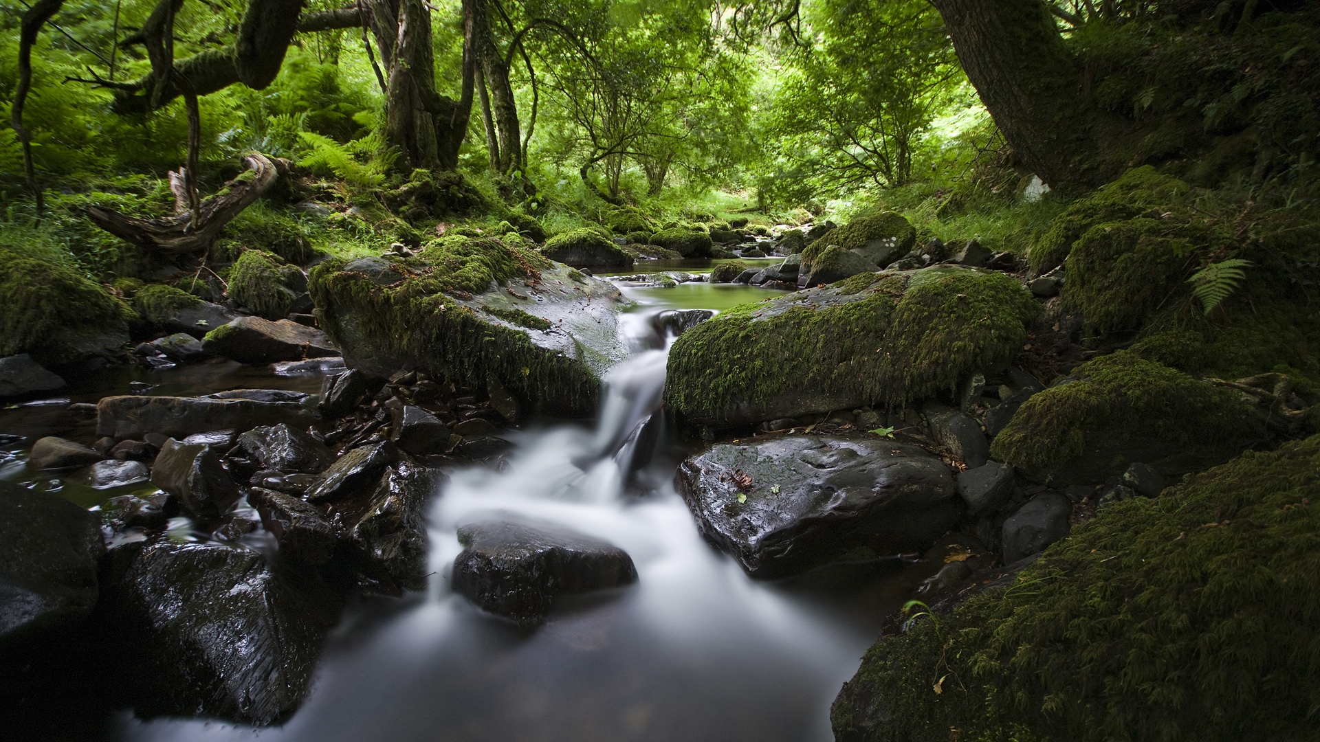 Description: A stream running through a lush green forest filled with rocks and trees.