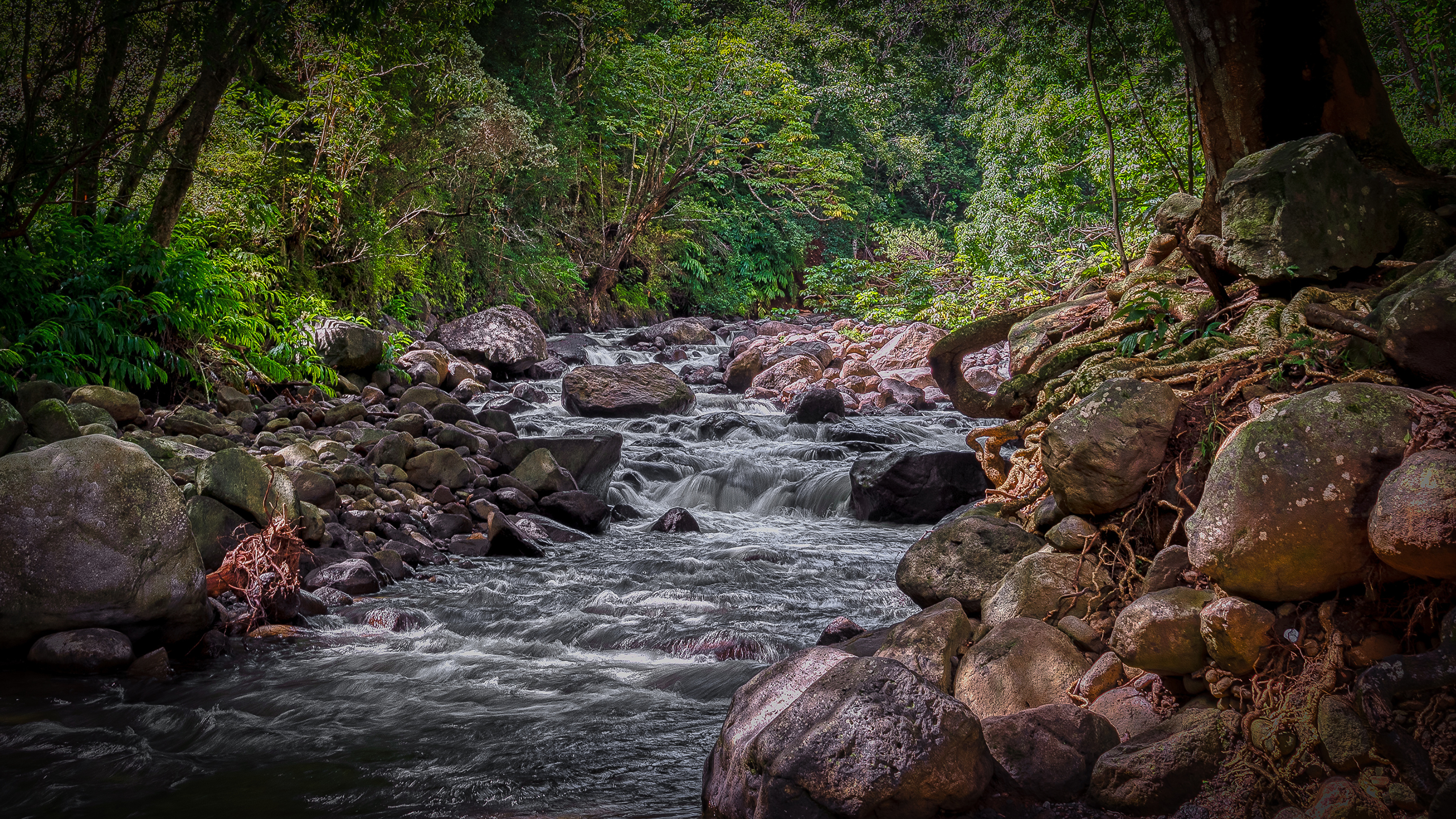Description: A stream running through a lush green forest filled with rocks and trees.