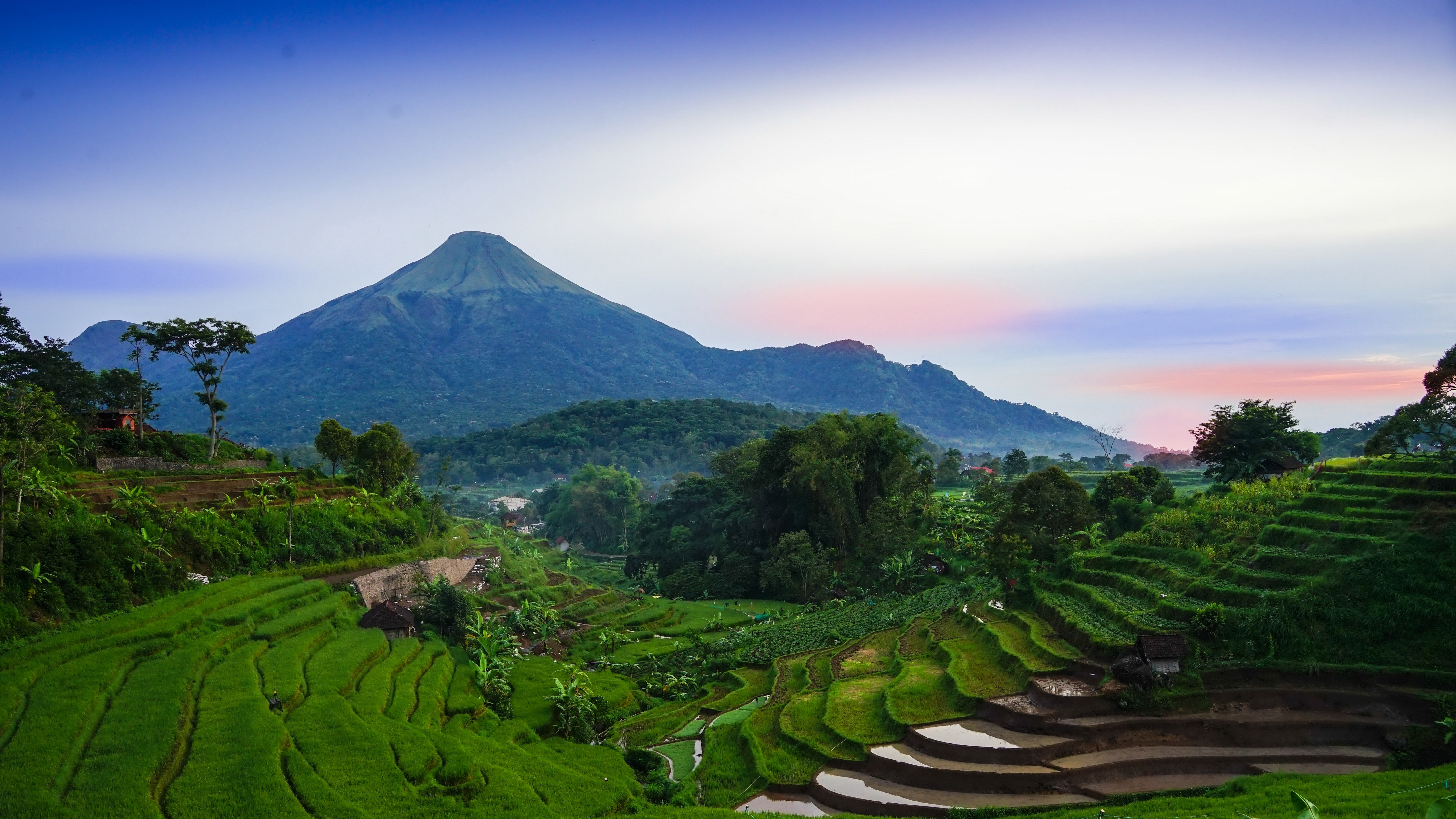 Description: A lush green hillside with a mountain in the background and steps leading up to it in the foreground.