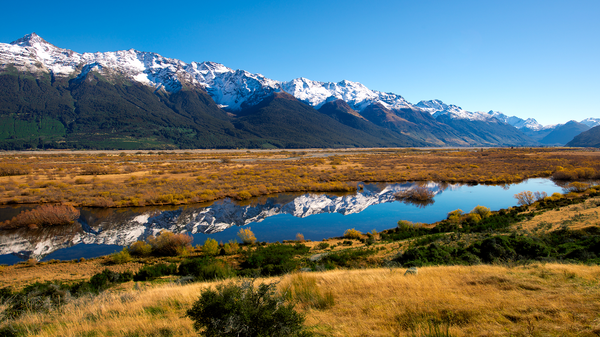 Description: A river running through a lush green field next to a mountain range with snow covered mountains in the background.