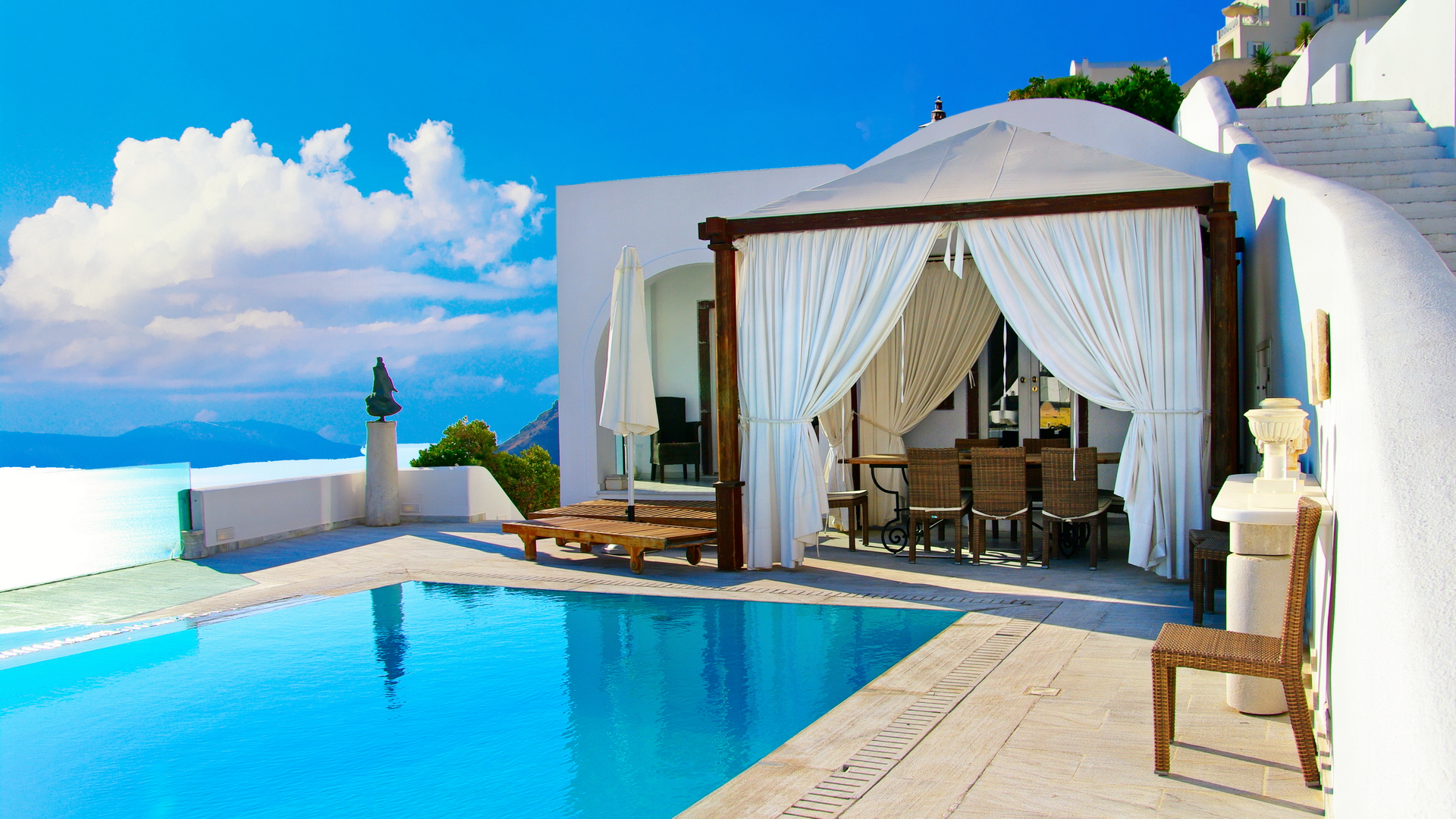 Description: A pool with a gazebo and a table and chairs next to it and a view of the ocean.
