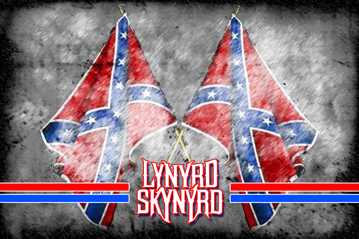 Description: A picture of two flags with the words lynnyrd skyyrd on it and a red white and blue stripe.