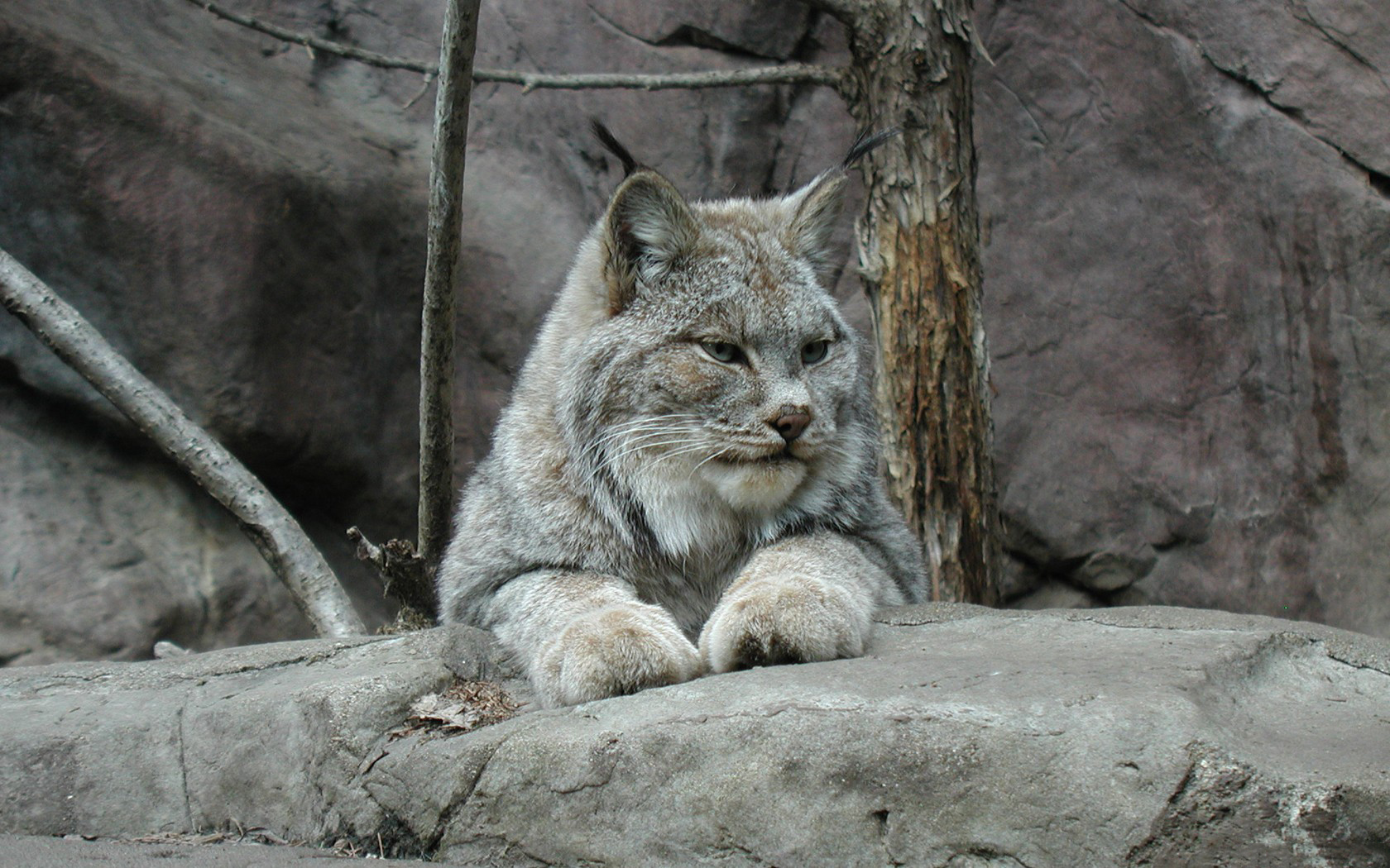 Description: A lynx sitting on a rock in front of a rock wall and trees in the background.