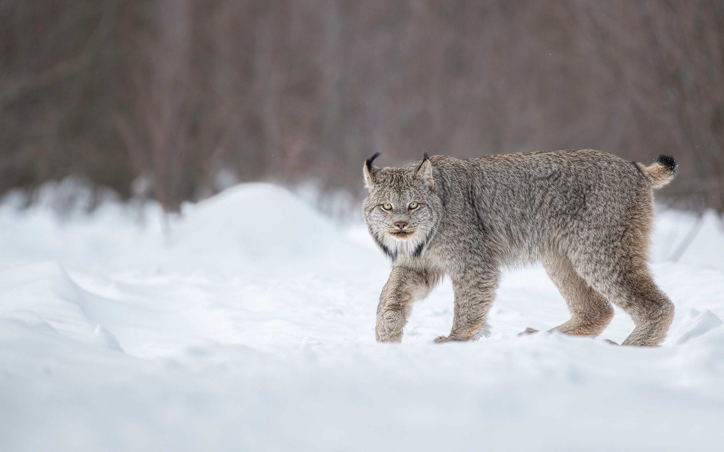 Description: A lynx walking through the snow in a wooded area with trees in the background and a few snow on the ground.