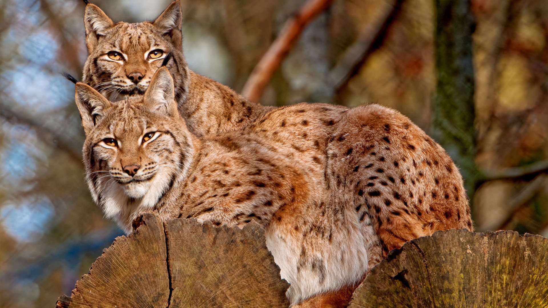 Description: Two lynxs are sitting on a tree stump in the woods.