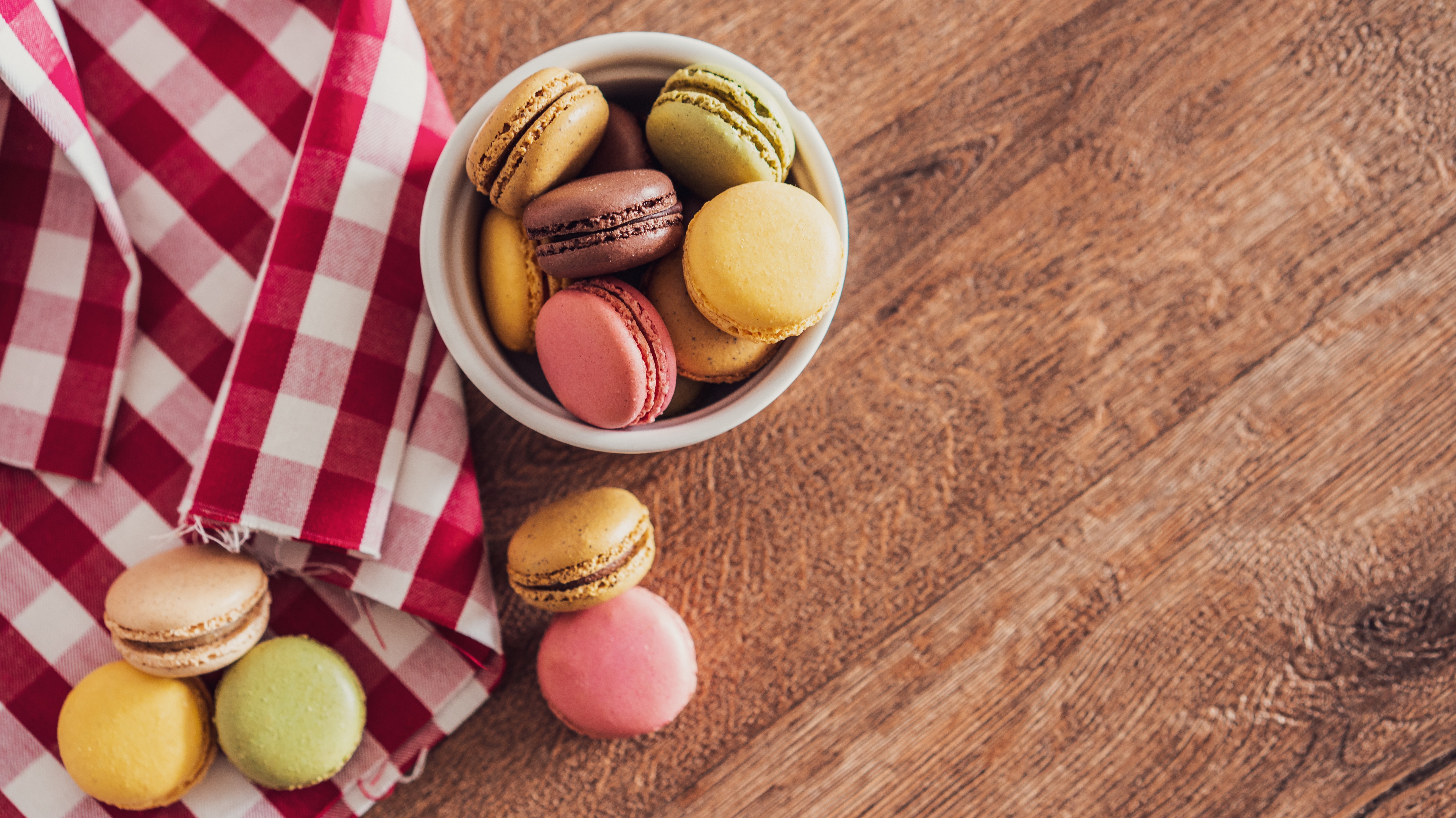 Description: A bowl of macaroons on a table with a checkered cloth on it and a red and white napkin.
