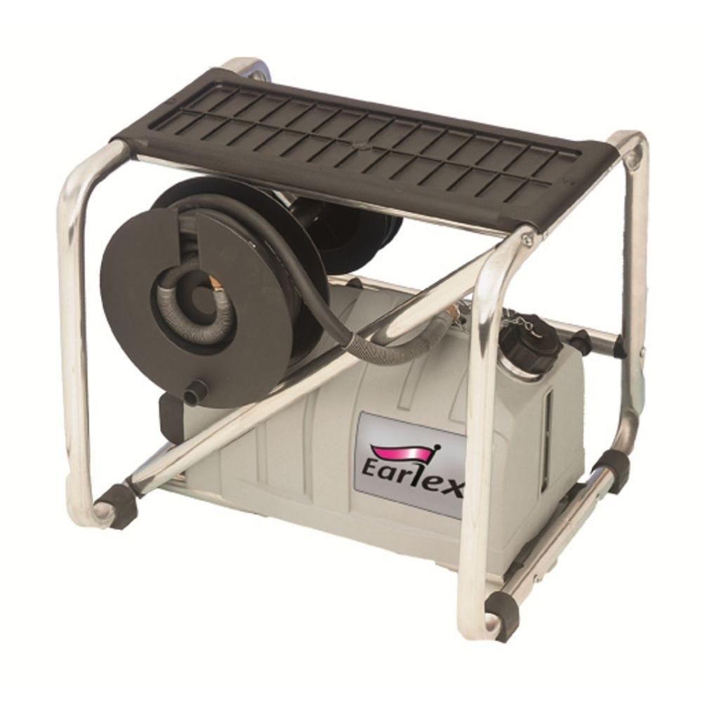 Description: A machine that is sitting on a stand with a roll of tape on it's side and a roll of tape on the other side.