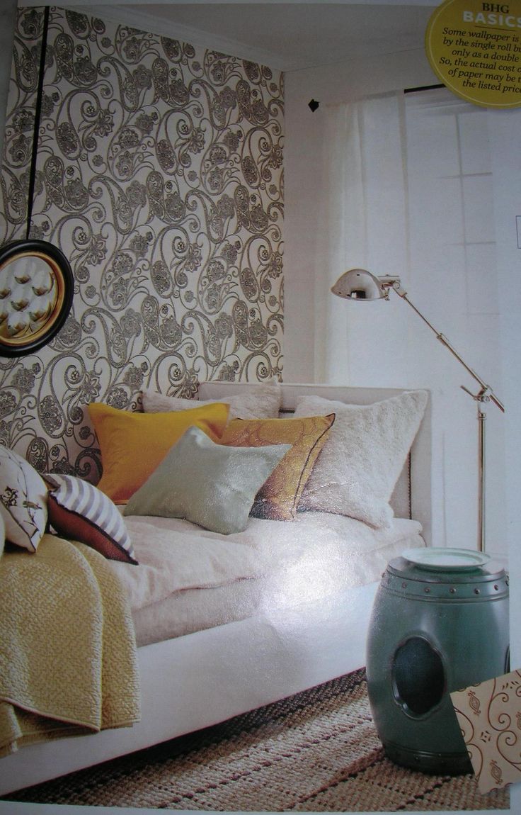 Description: A magazine with a picture of a bed and a lamp on the wall next to it and a vase.