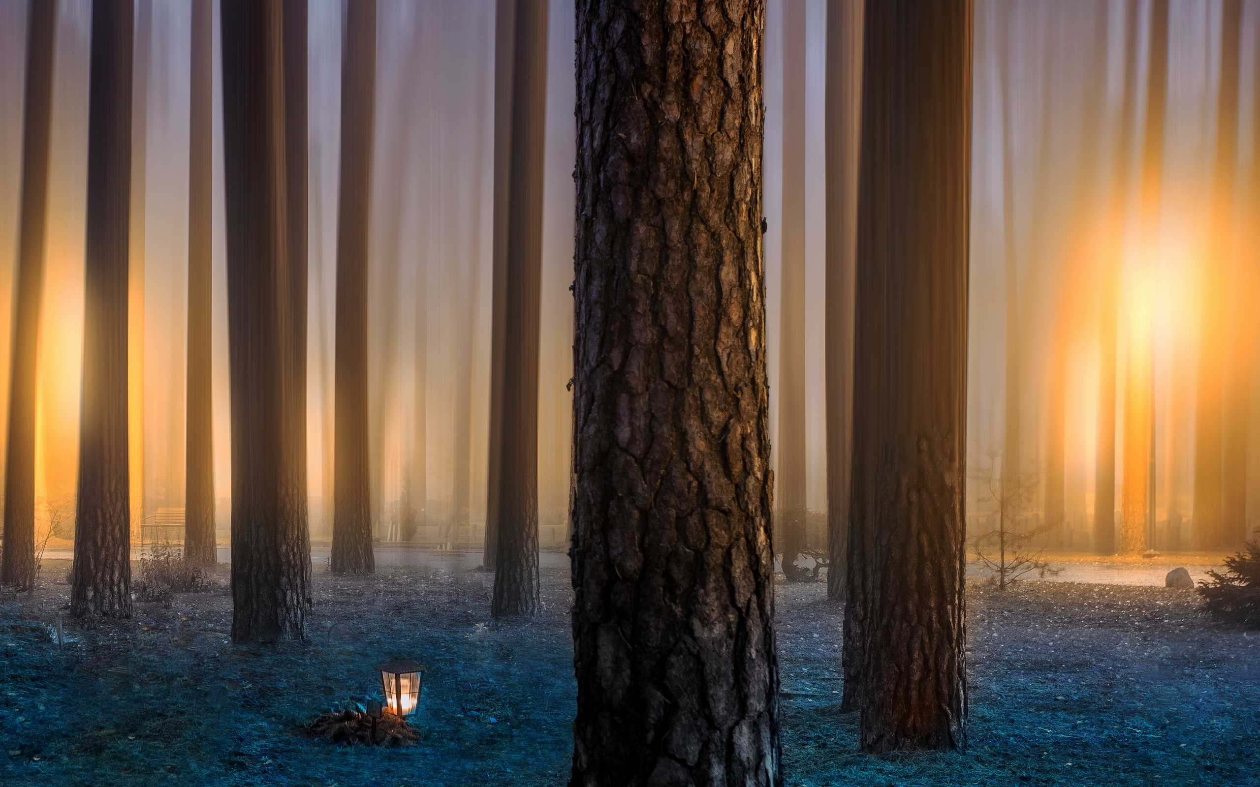 Description: A forest with a light shining through the trees and a person sitting on a bench in the middle of the forest.