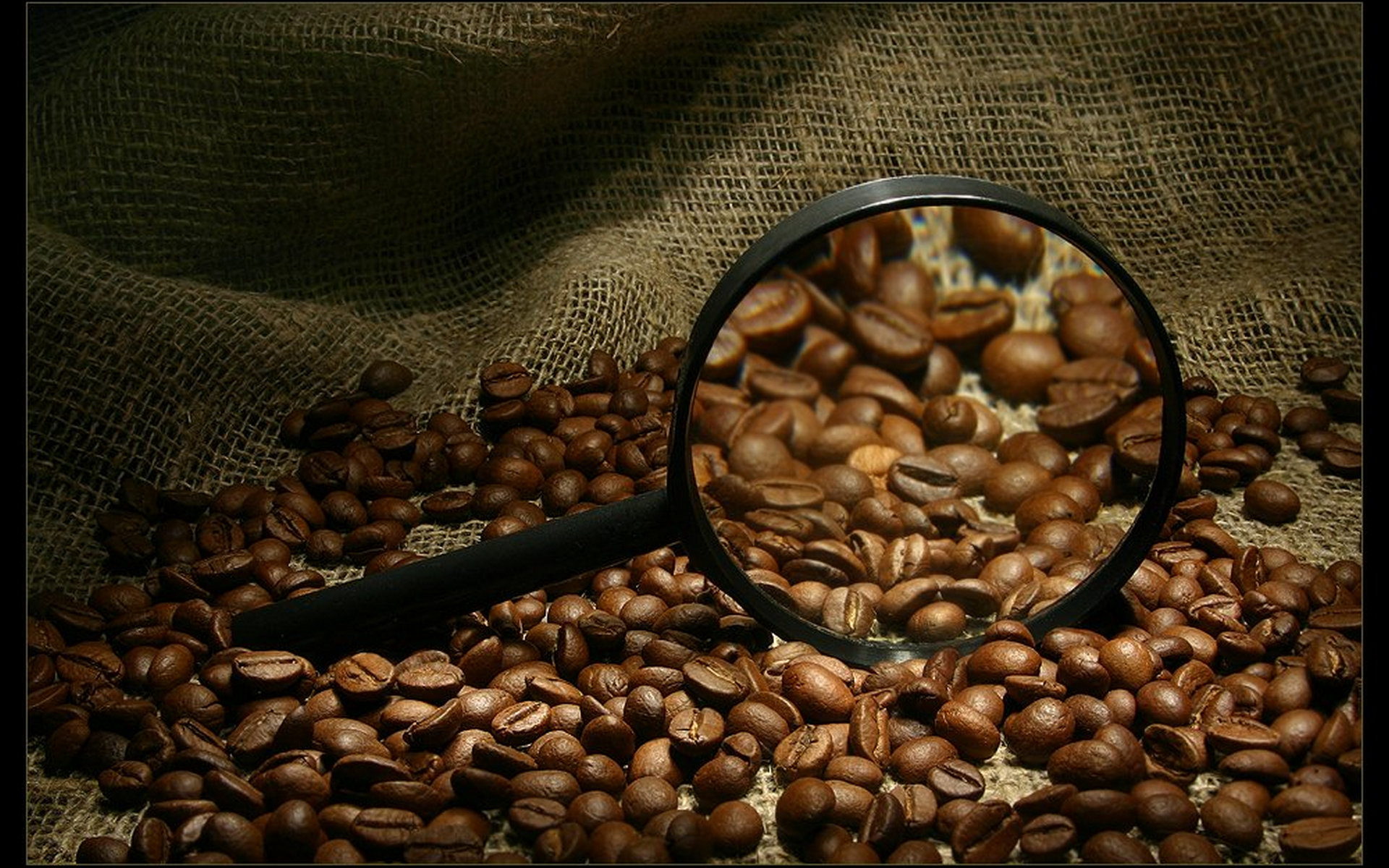 Description: A magnifying glass over a pile of coffee beans on a burlocked cloth with a sack of burlock.