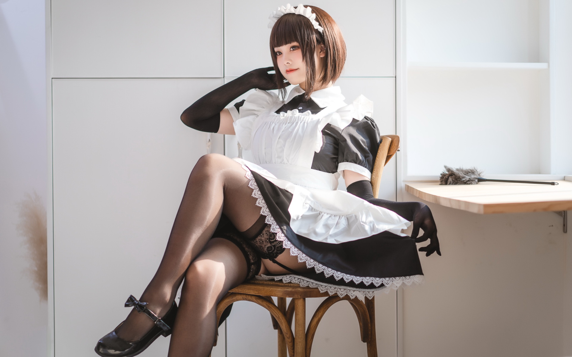 Description: A woman in a maid outfit sitting on a chair with her legs crossed and her legs crossed.
