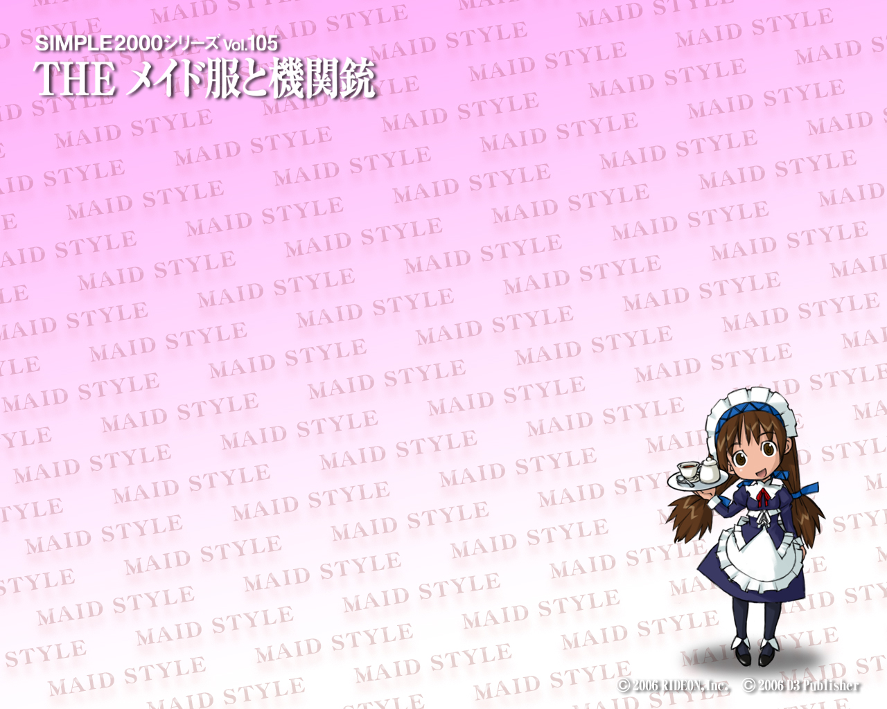 Description: A girl in a maid outfit holding a cat in her hand and a pink background with the words the anime style.