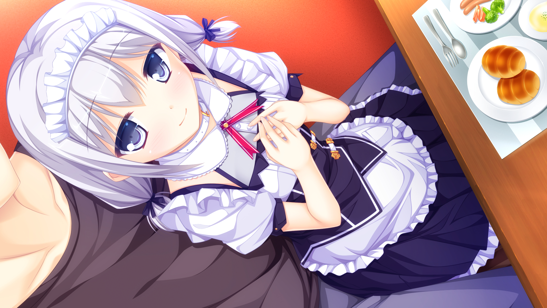 Description: A woman in a maid outfit is sitting at a table with food on it and a plate of food on the table.