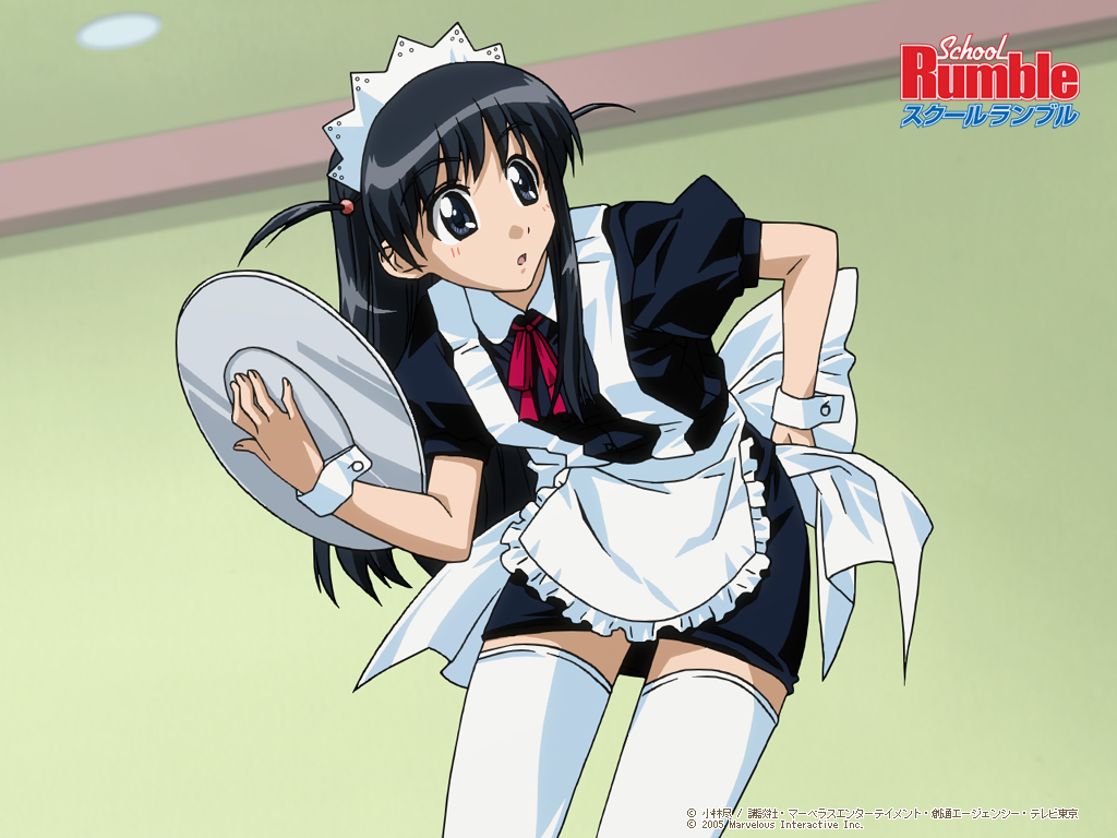 Description: A woman in a maid outfit holding a plate of food in her hand and looking at the camera with a smile on her face.