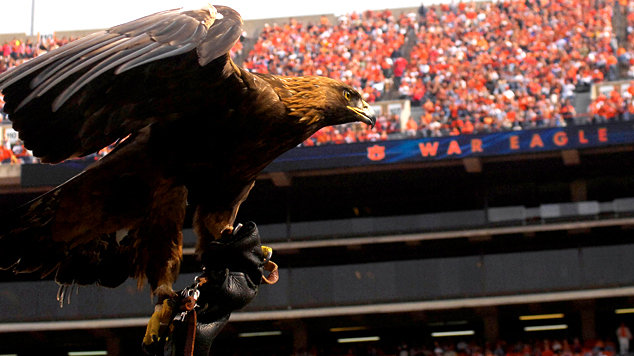 Description: A large bird of prey being held by a person in a stadium with a crowd of people watching it.
