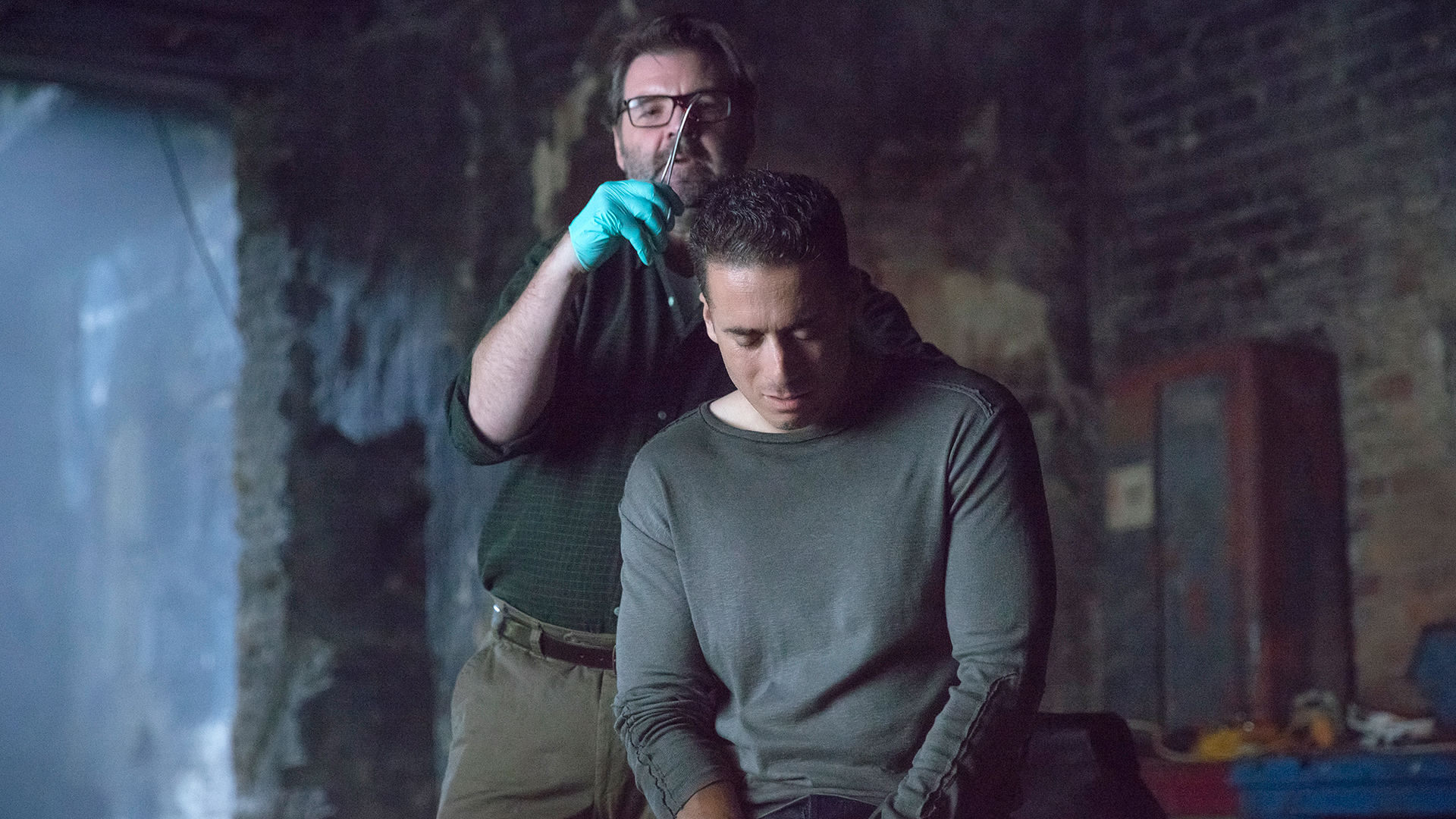 Description: A man is standing next to another man in a room with a brick wall and a green glove on his hand.