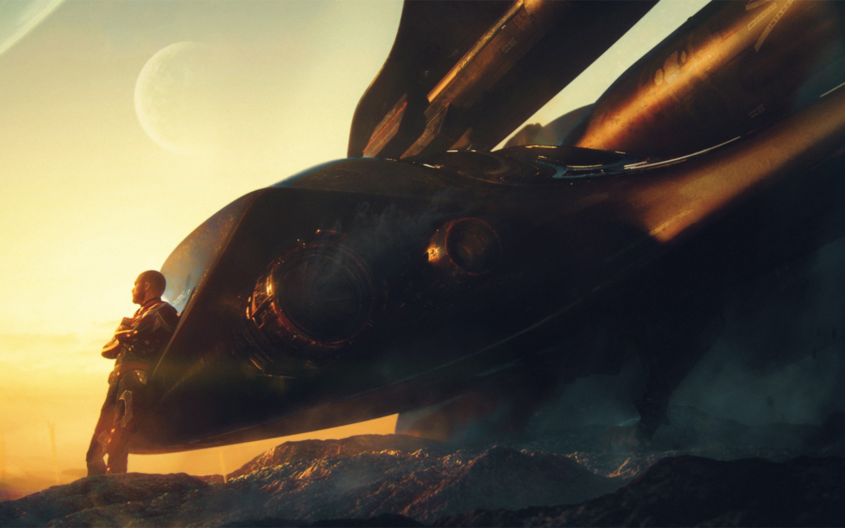 Description: A man standing next to a large airplane in the desert at sunset or sunrise or sunrise or sunset.