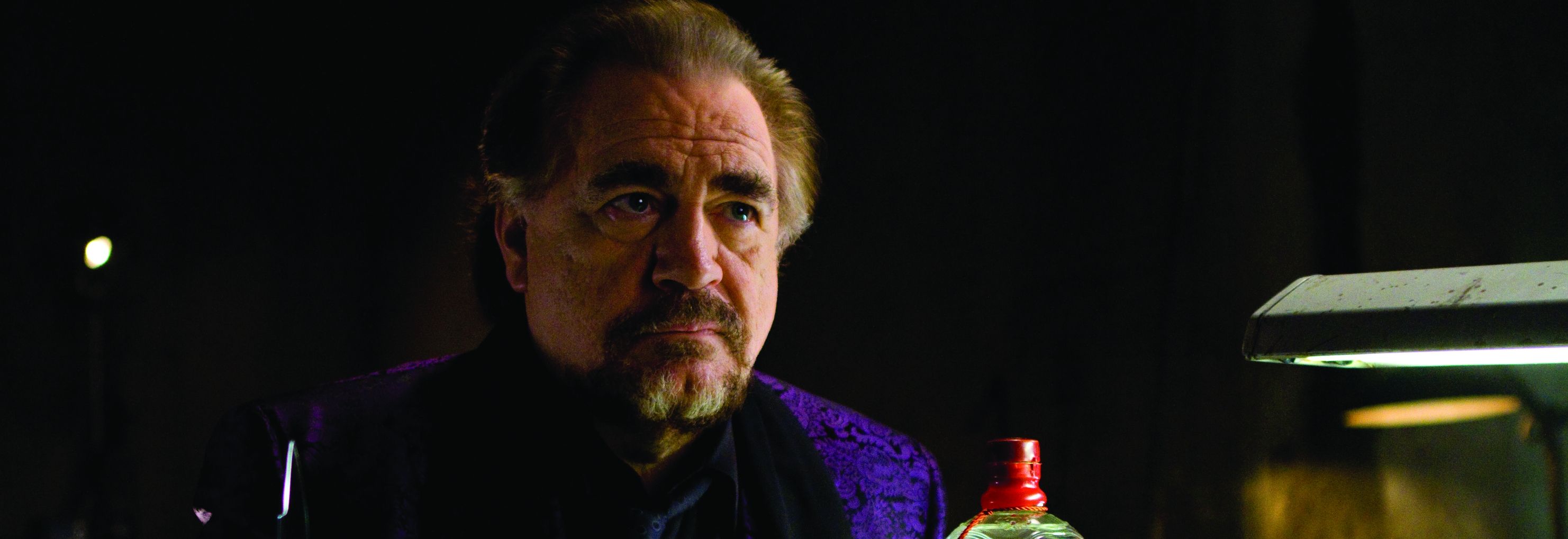 Description: A man with a bottle of alcohol in his hand in a dark room with a lamp on the side.