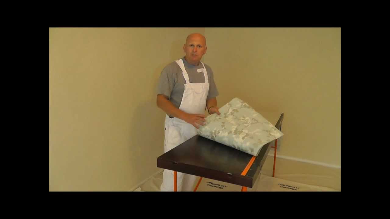 Description: A man in an apron is holding a sheet of fabric on a table top with a chair in the background.