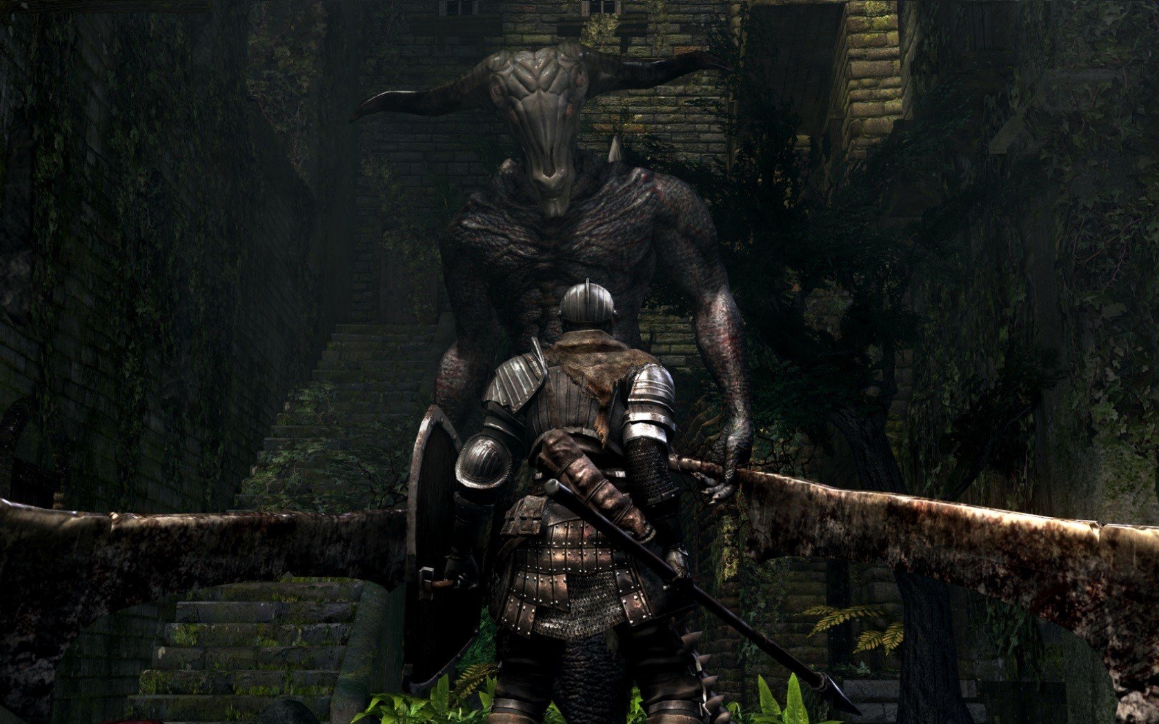 Description: A man in armor walking through a forest with a giant demon on his back and a sword in his hand.
