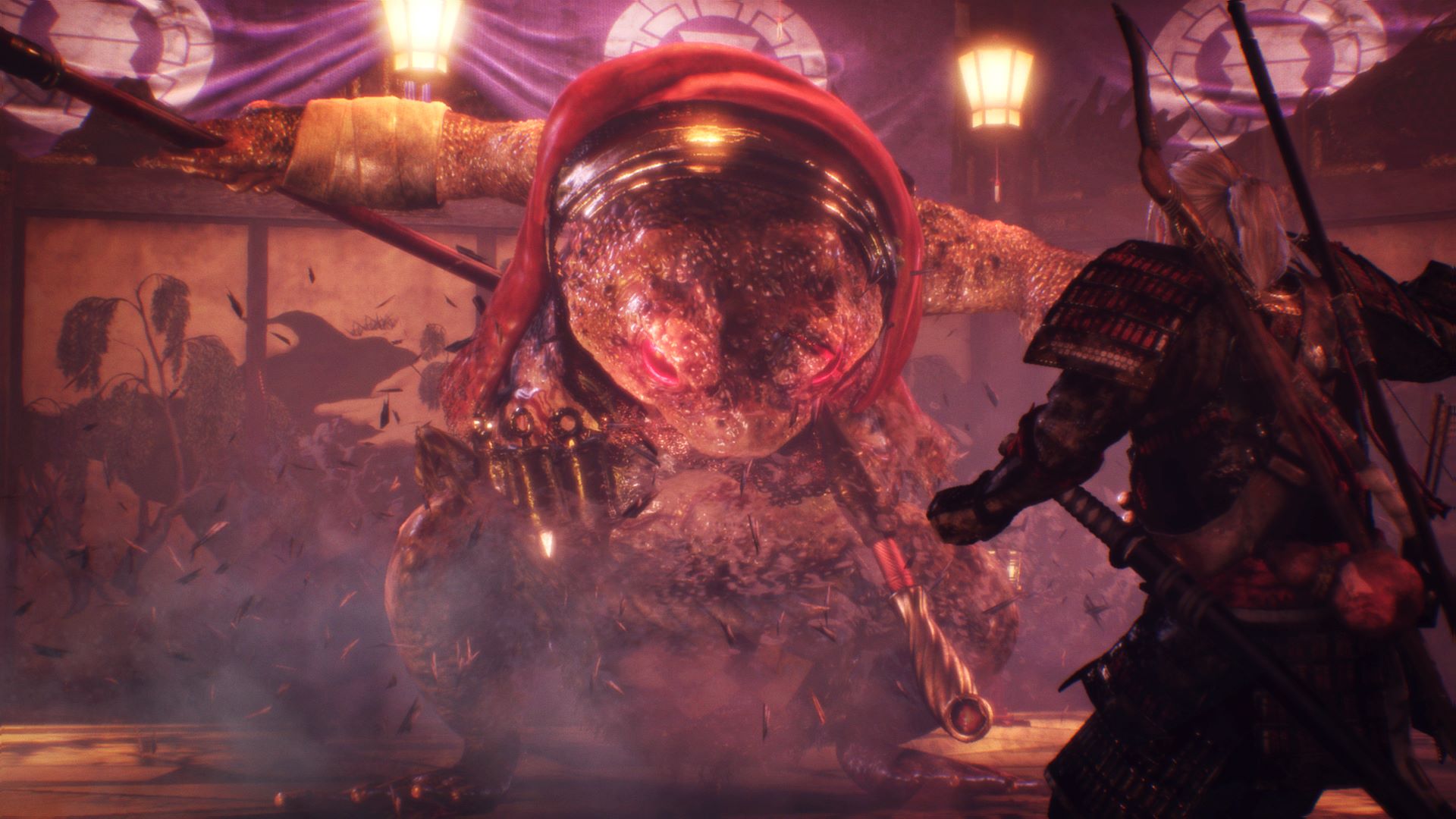 Description: A man in armor standing next to a giant robot in a room with lights on it and a red scarf.