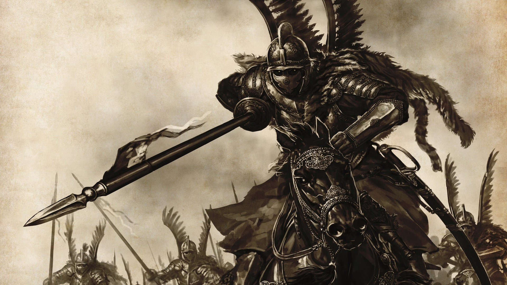 Description: A man in armor holding a sword and a sword in his hand with a lot of other men in the background.