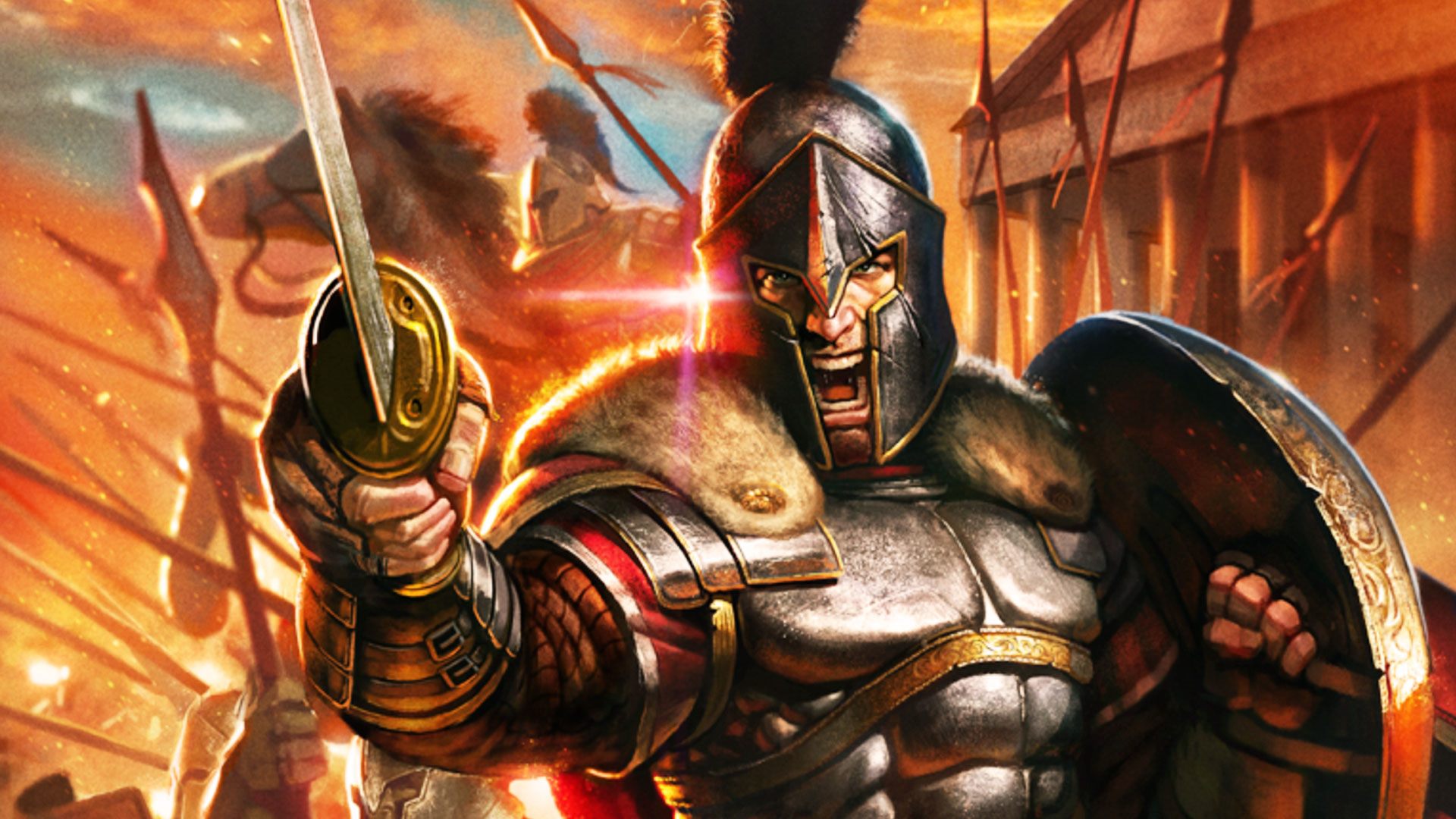 Description: A man in armor holding a sword and a sword in his hand with flames in the background and a city.