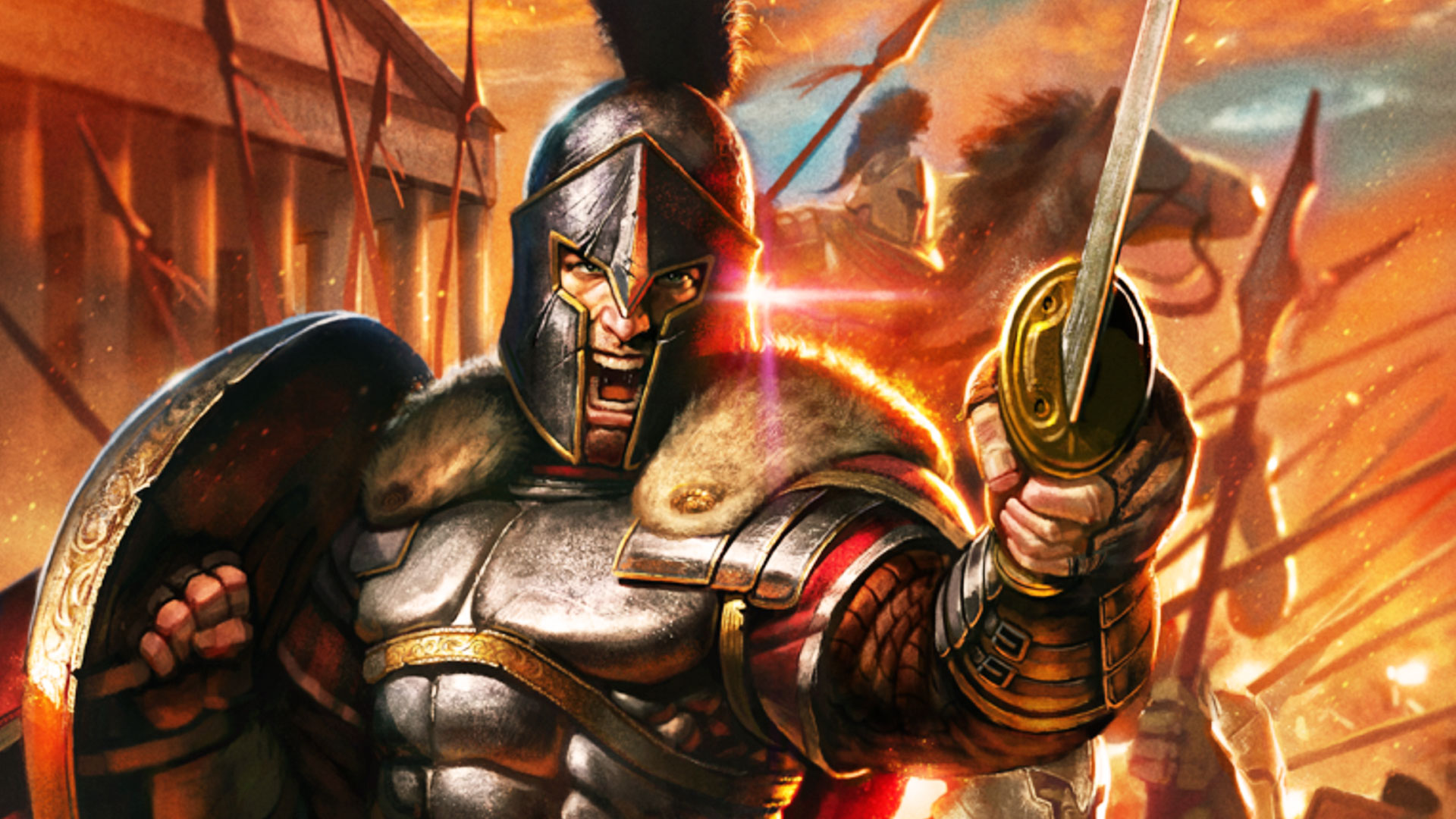 Description: A man in armor holding a sword and a sword in his hand with flames in the background and a city.