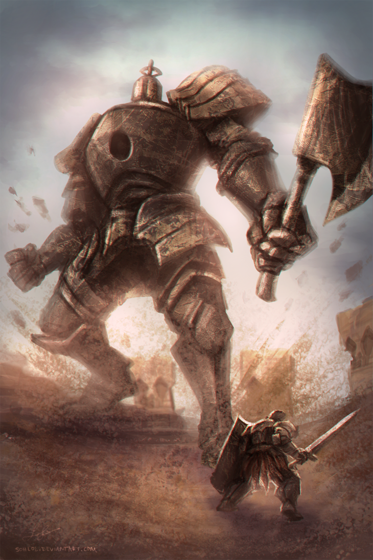 Description: A man in armor holding a sword and a shield in his hand while standing on a field with a sky background.