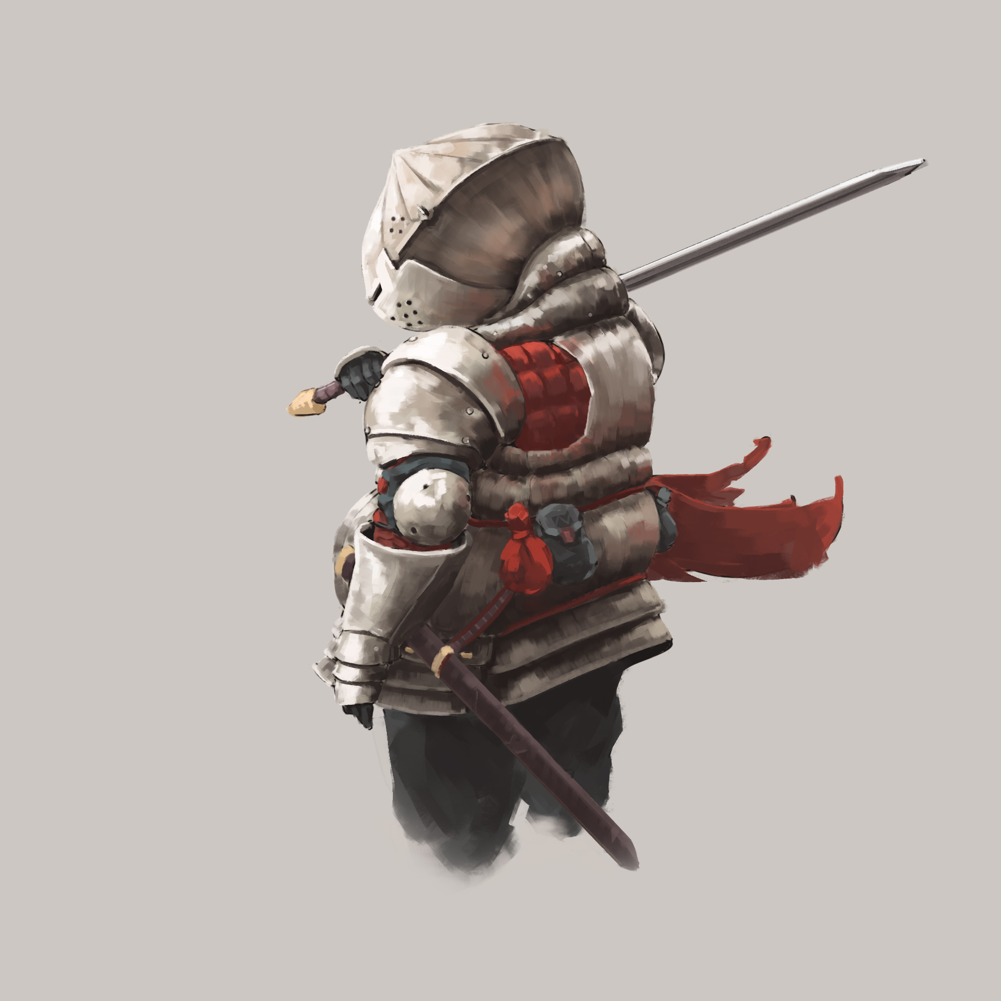 Description: A man in a suit of armor holding a sword and a shield with a red cape on his back.