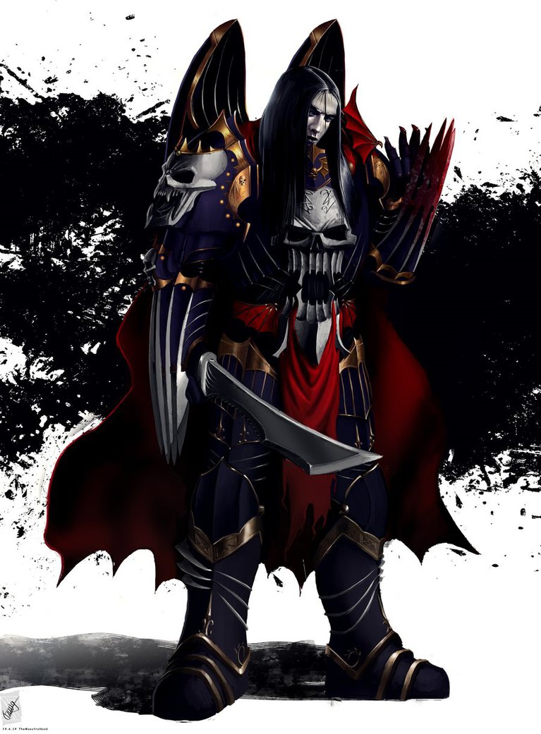 Description: A man dressed in armor with a sword and a skull on his chest and a helmet on his head.